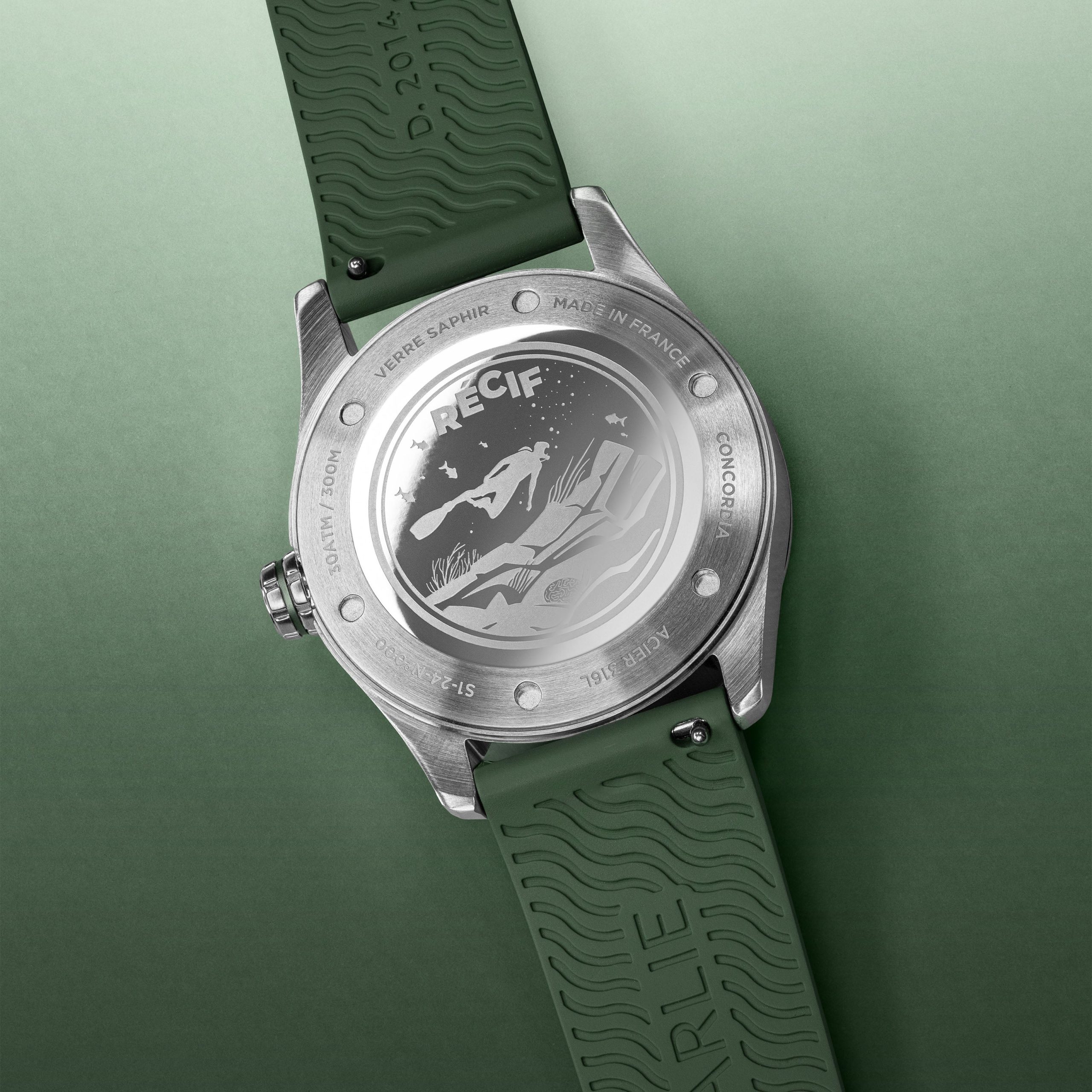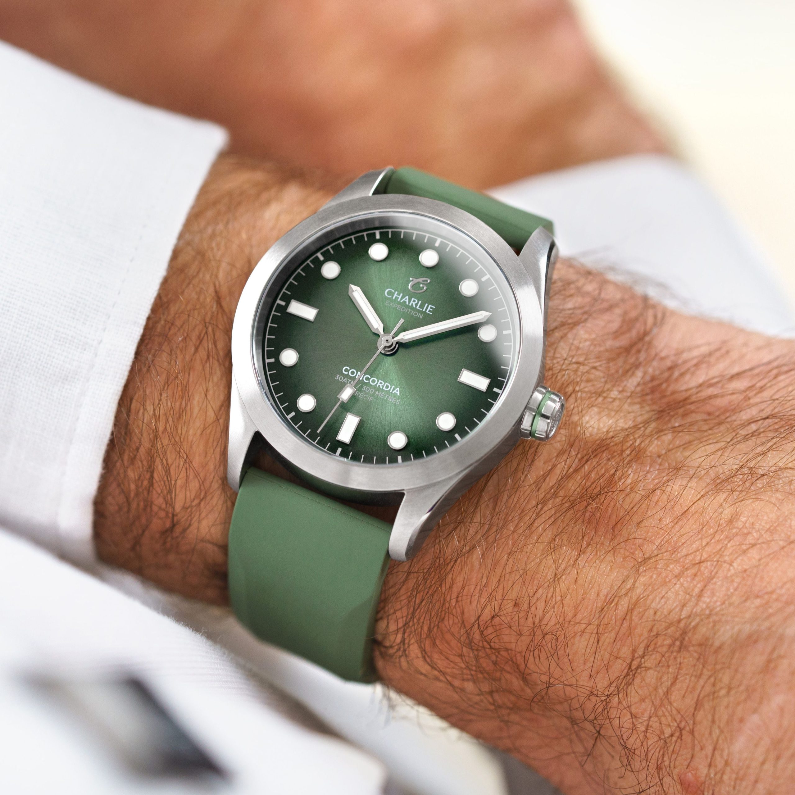 | Reim | Sage green NBR rubber, Steel 3-link bracelet |