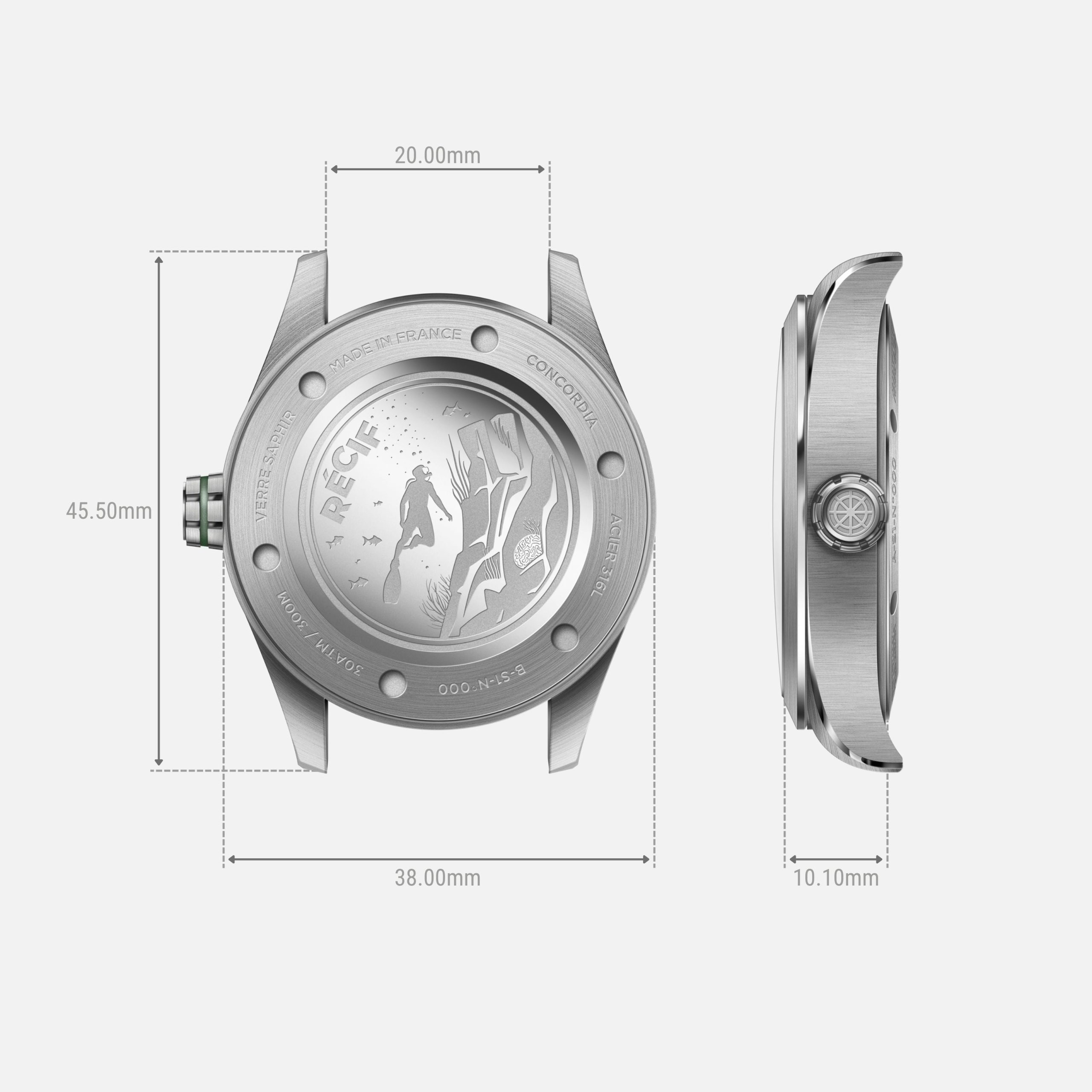 Designet og montert i Frankrike. Verktøyklokke for daglig bruk. Seiko kvartsverk, 38mm stålkasse, vanntett til 300m. Utbyttbare reimer.