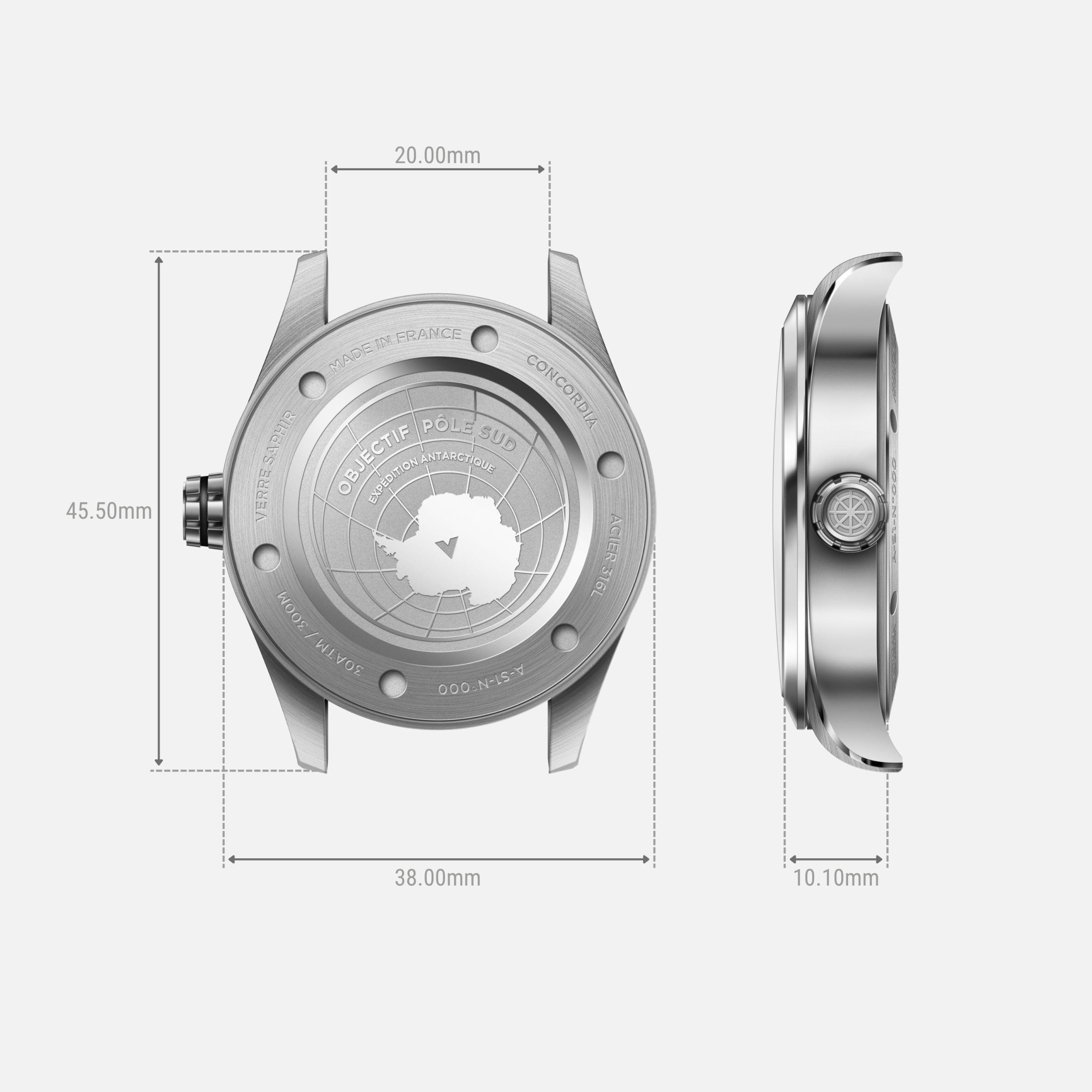 - Urkasse: 316L rustfritt stal, 38 mm diameter, 45.5 mm lengde, 11.1 mm tykkelse