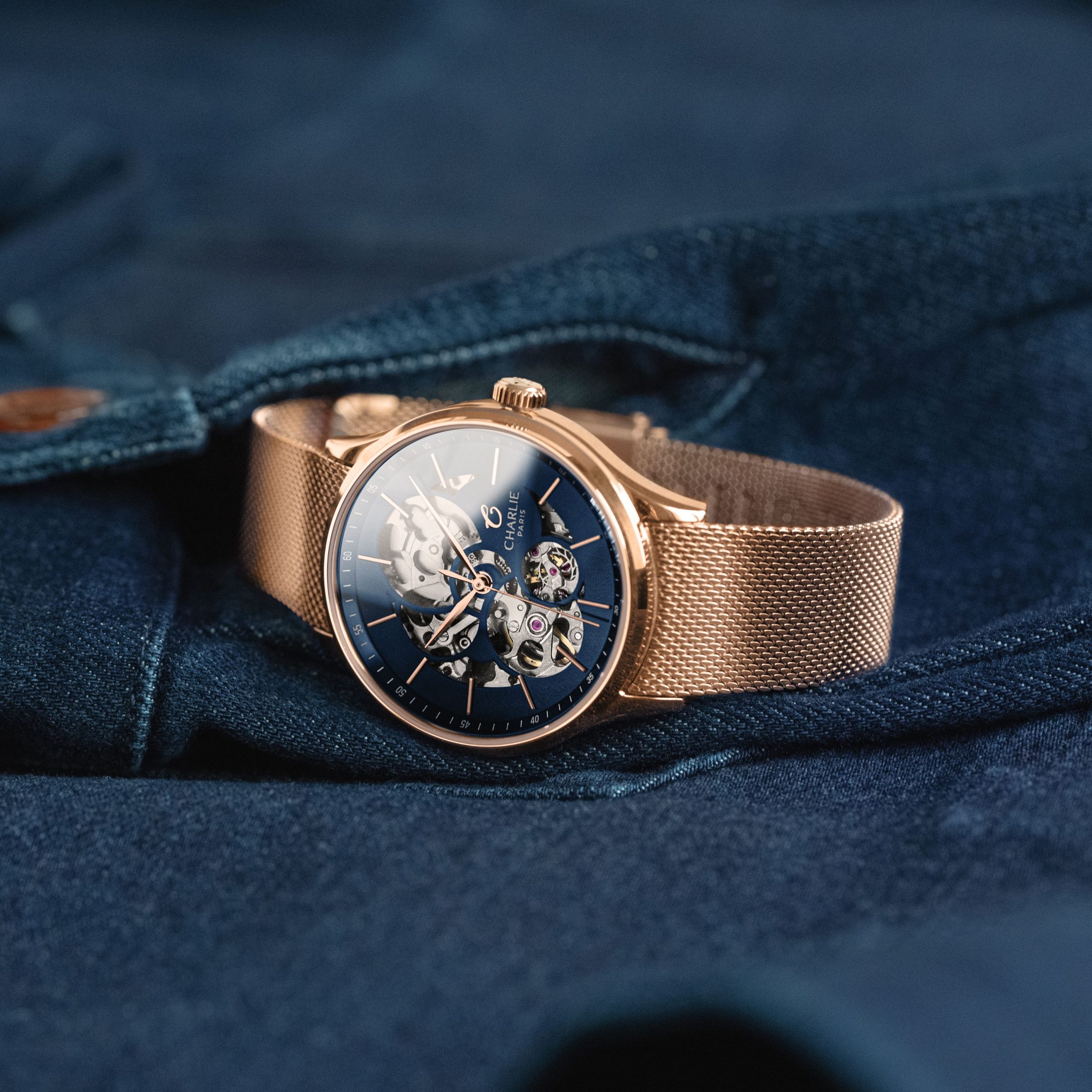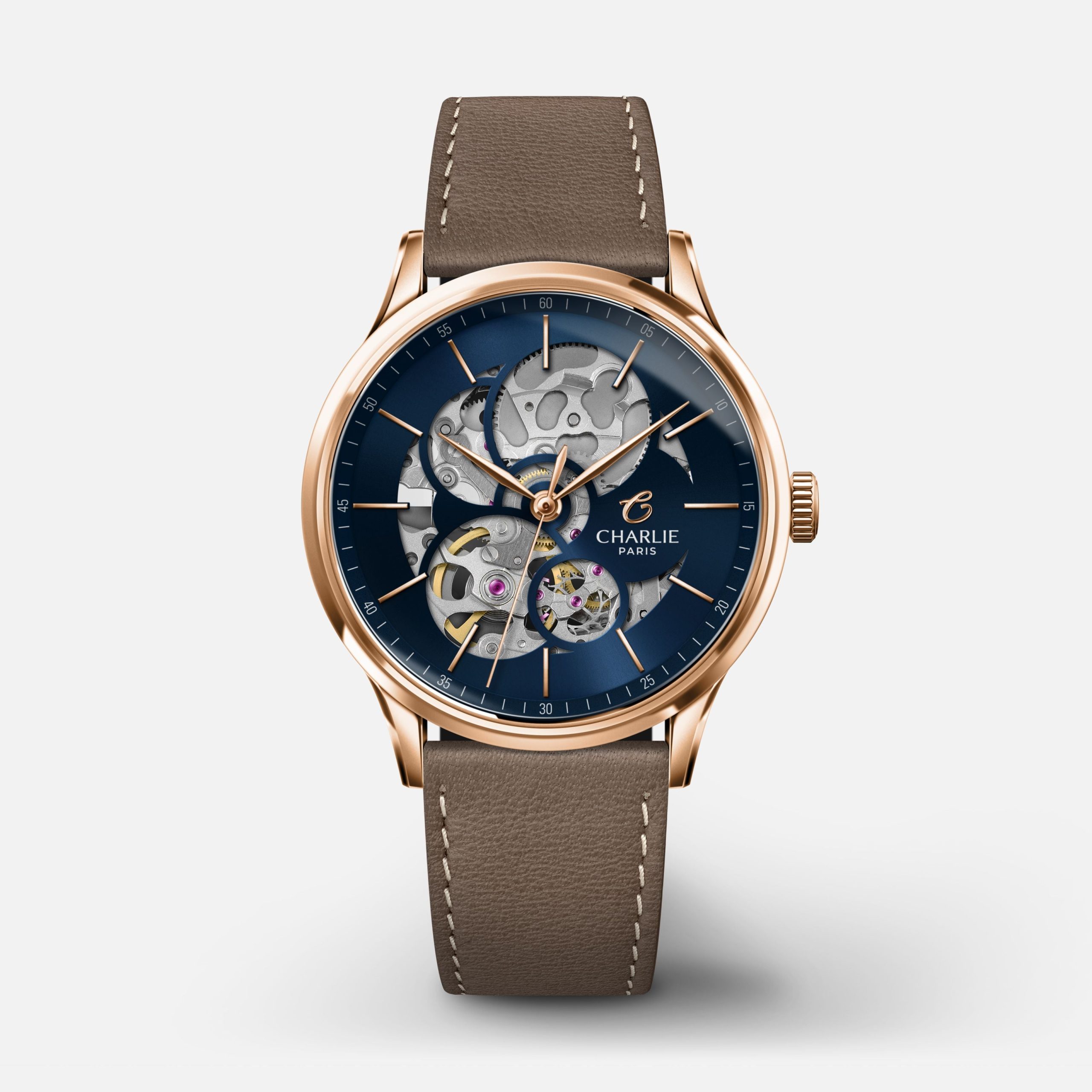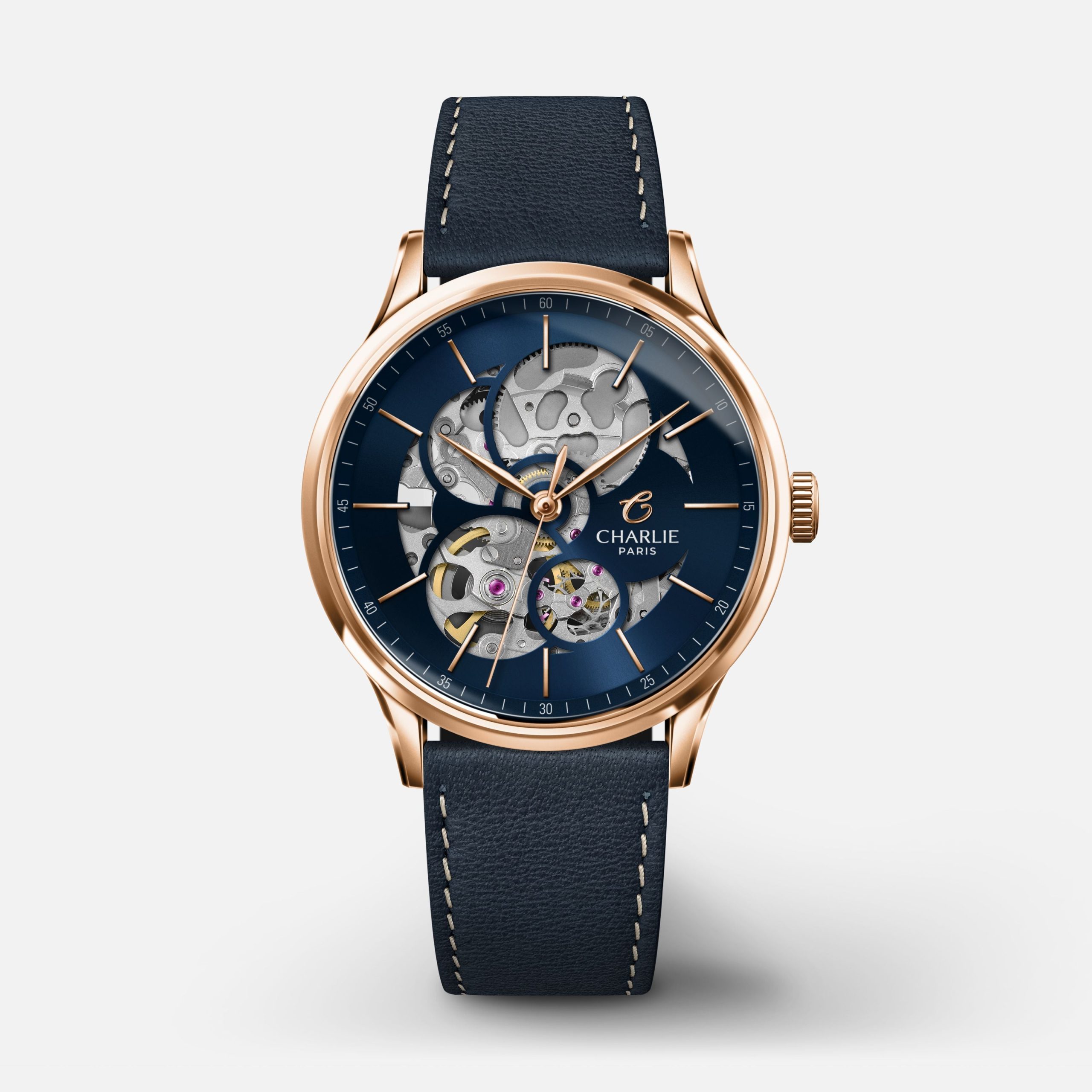 Designet og montert i Frankrike. Denne automatiske skjelettklokken for damer har en kombinasjon av rosegull og blått, med rene linjer som forener klassisk og moderne estetikk. Synlig verk med utbyttbare 18mm reimer. 36mm kasse i rosegull.