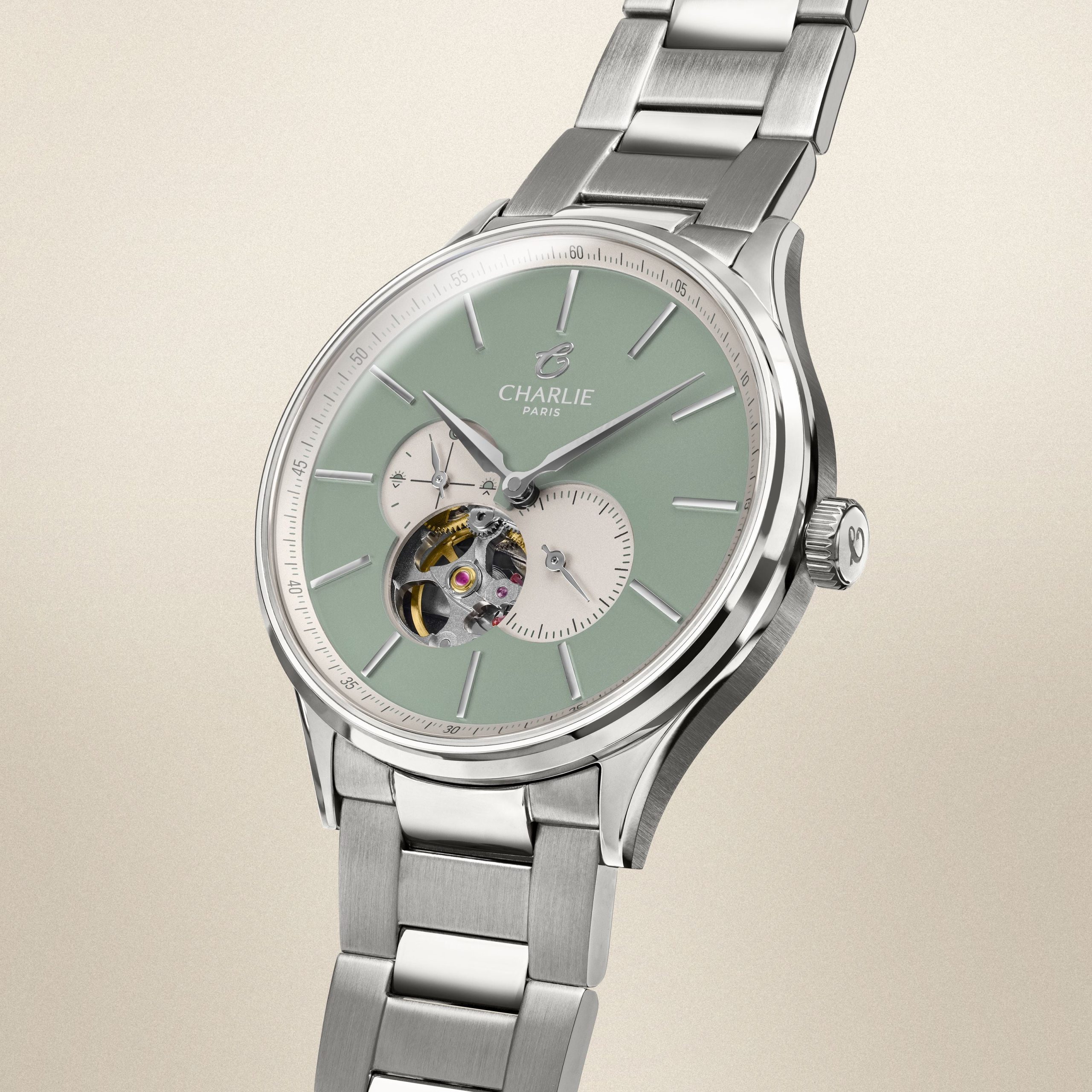 Designet og montert i Frankrike. Denne automatiske herreklokken har en grønn Spring Green skive med åpent hjerte (open heart) som viser urverkets mekanikk. Rene linjer forener klassisk og moderne estetikk. Utstyrt med Citizen Miyota Calibre 82S7 automatisk urverk. 40mm kasse i 316L rustfritt stål med safirglass og utbyttbare reimer. Begrenset opplag på 50 eksemplarer.
