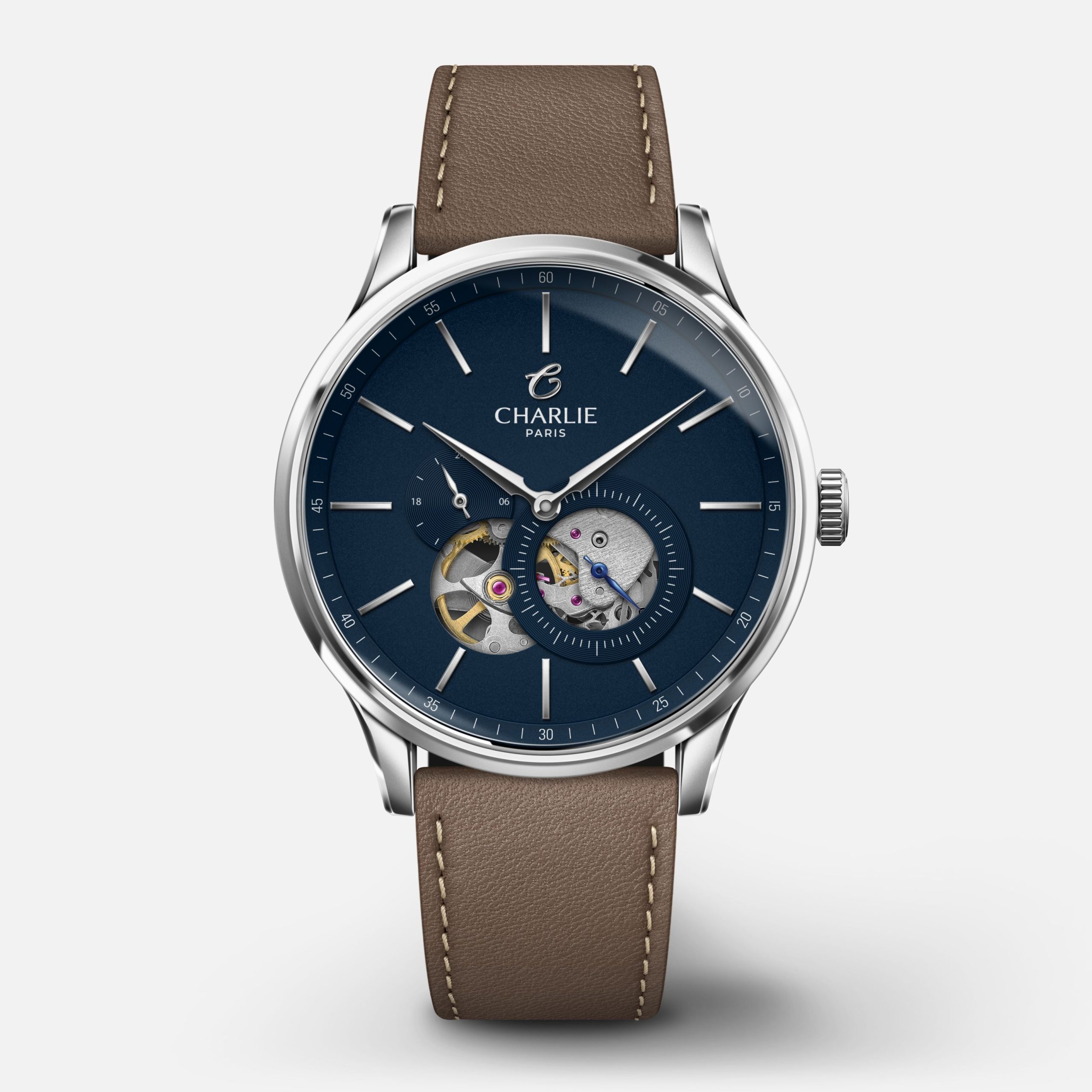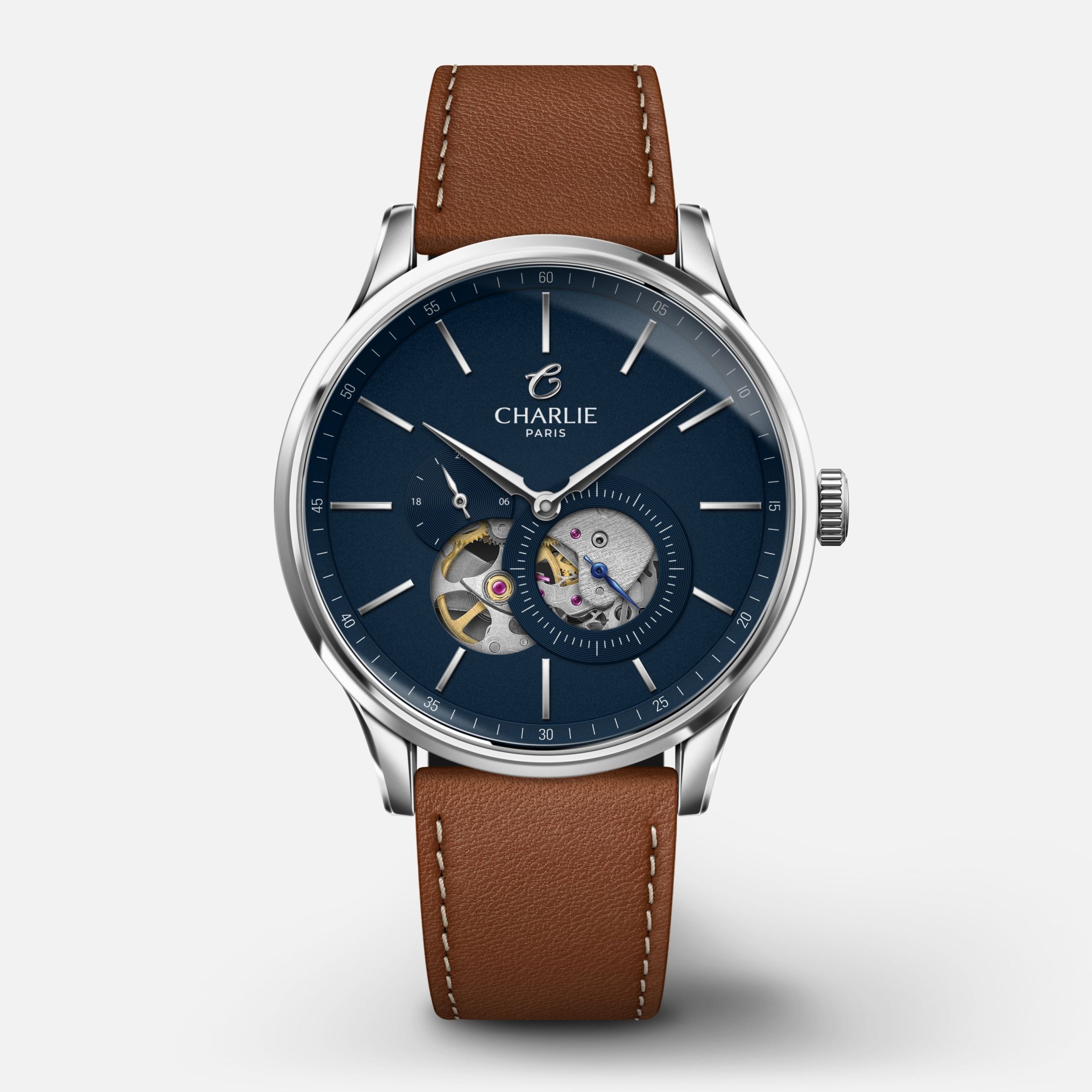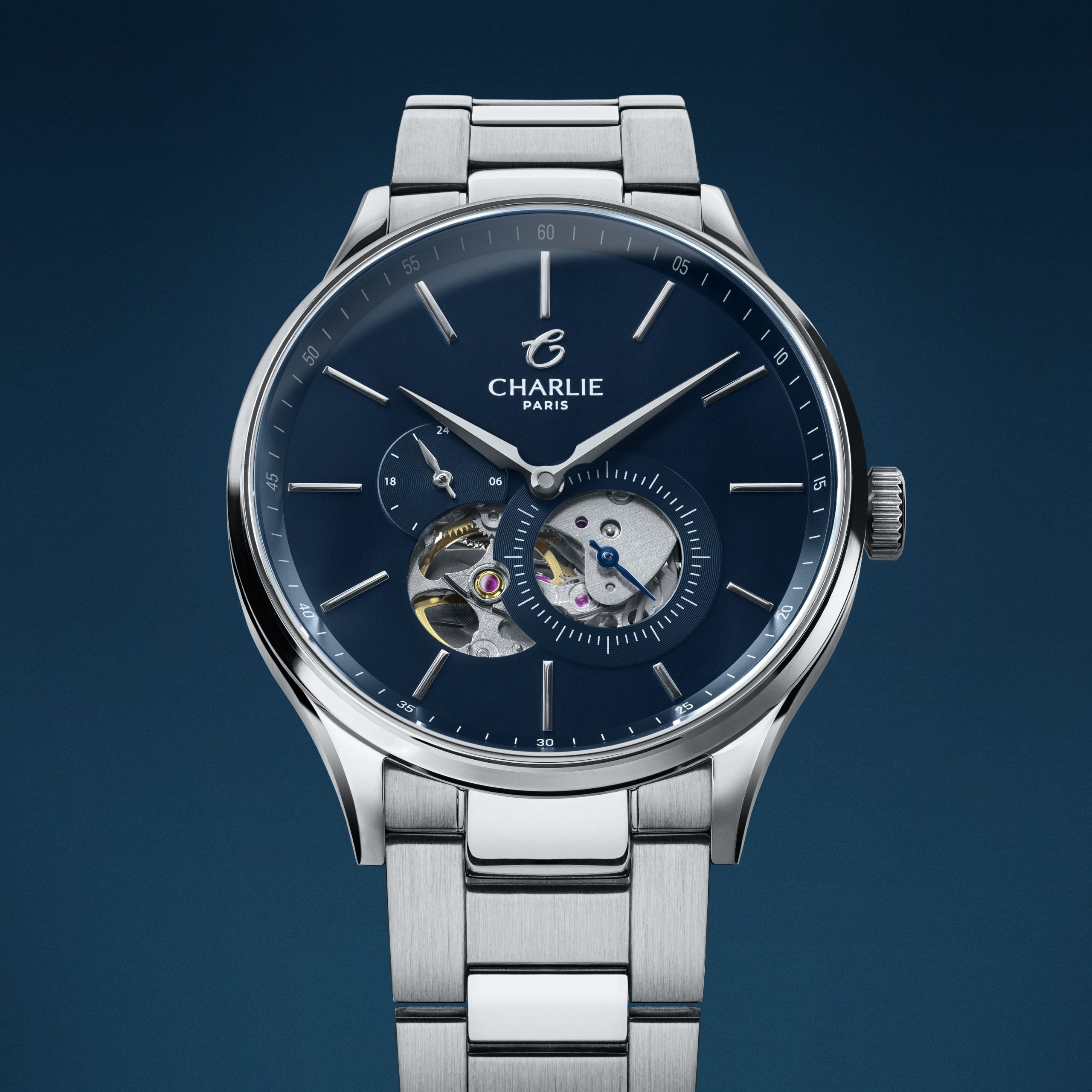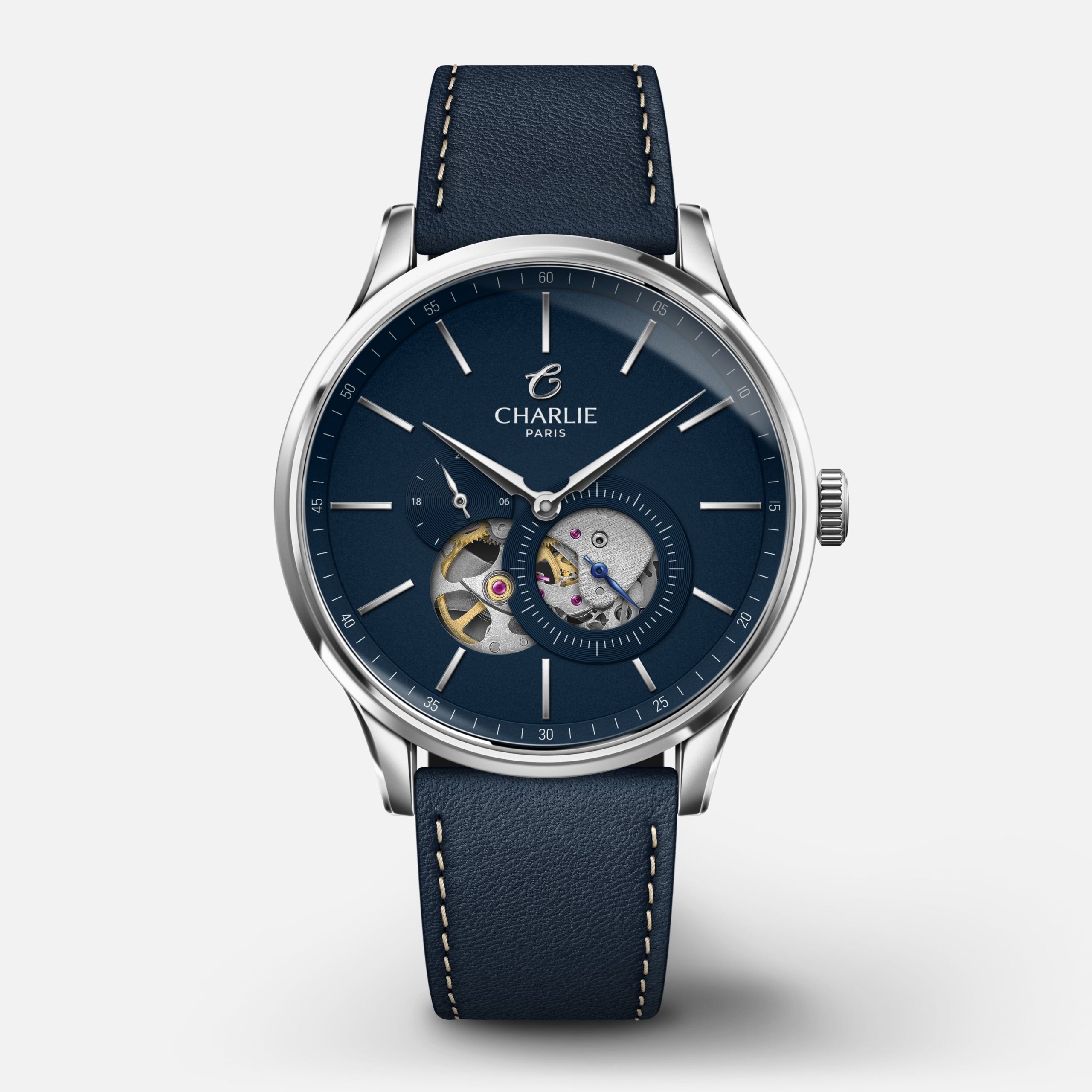 Designet og montert i Frankrike. Denne automatiske herreklokken har en sollyst blå skive med rene linjer som forener klassisk og moderne estetikk. Den huser et Citizen Miyota Calibre 82S7-verk synlig gjennom baksiden, og kombinerer en 40mm kasse i 316L stål med safirglass og utbyttbare reimer for langvarig bruk.