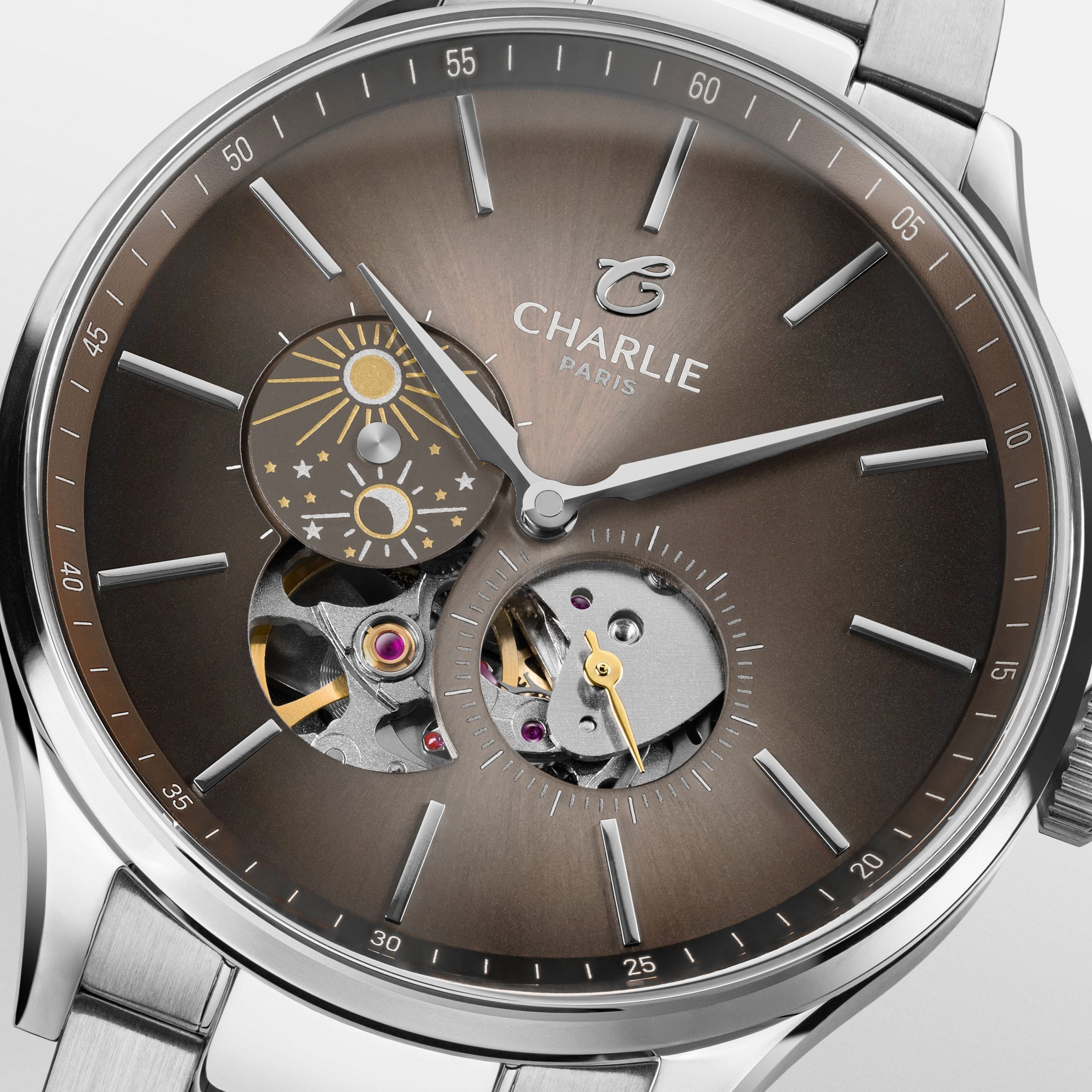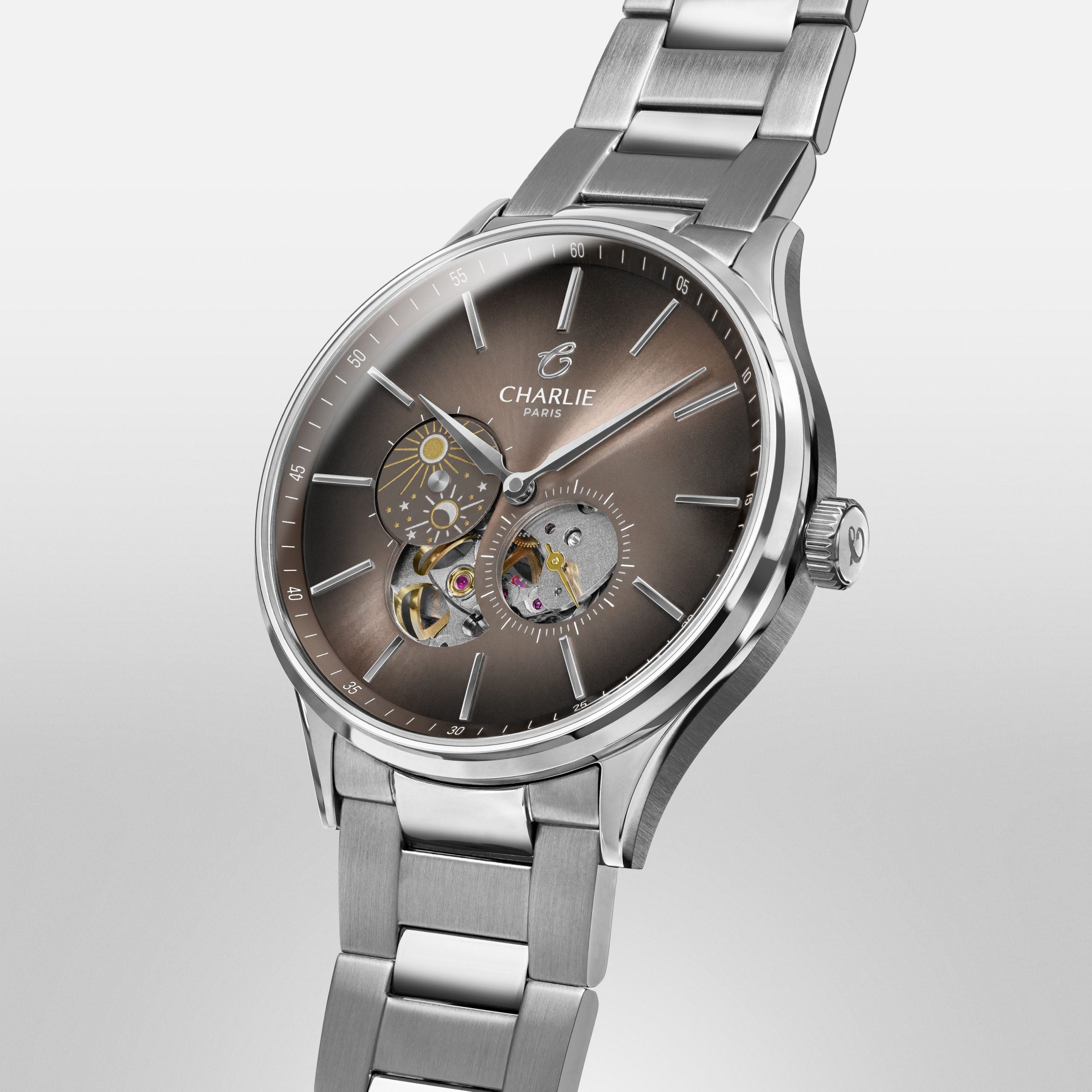 Designet og montert i Frankrike. Initial Open Heart Day/Night har en sollyst taupe skive med rene linjer. Citizen Miyota automatisk verk med dag/natt-komplikasjon, 40mm stålkasse, safirglass, utbyttbare reimer.