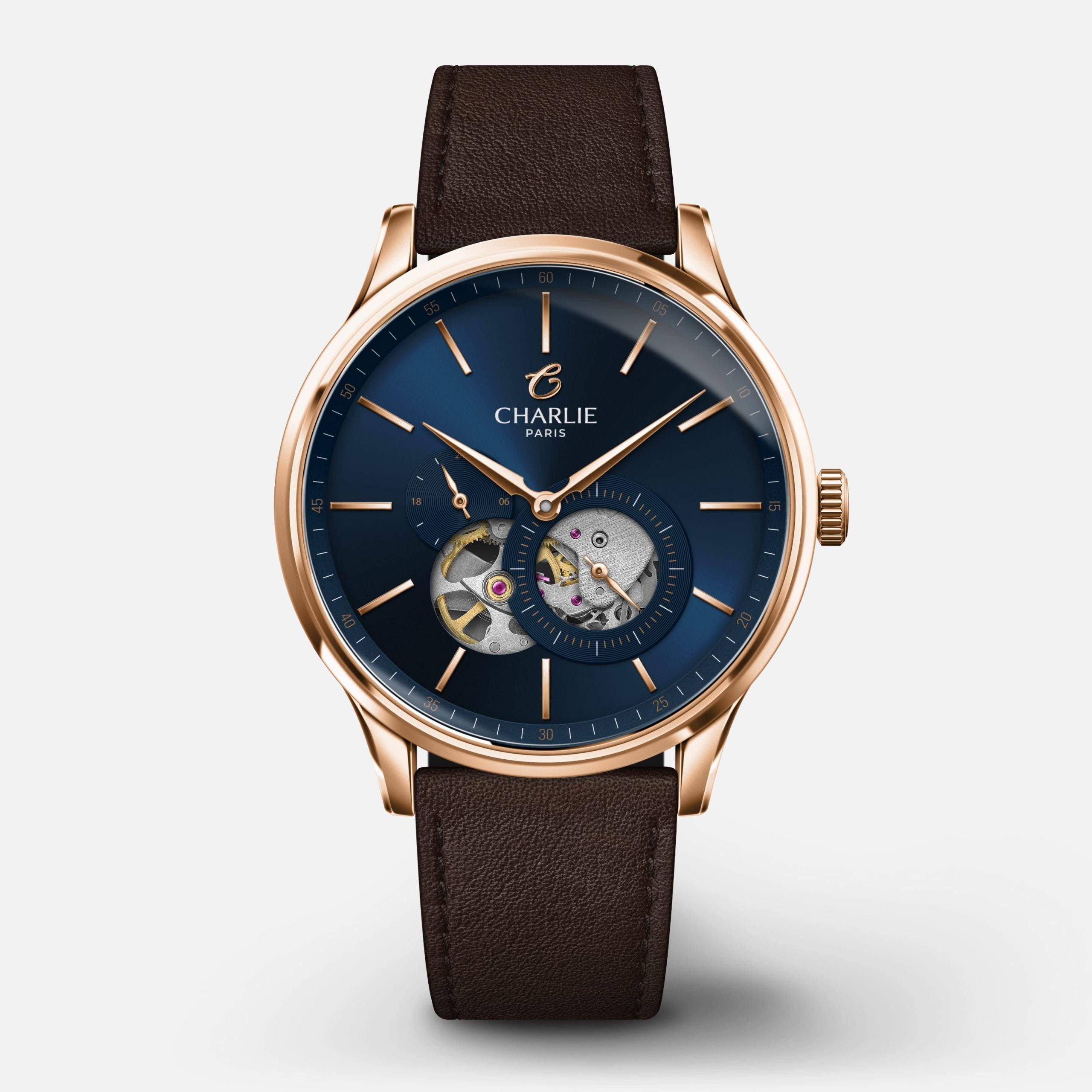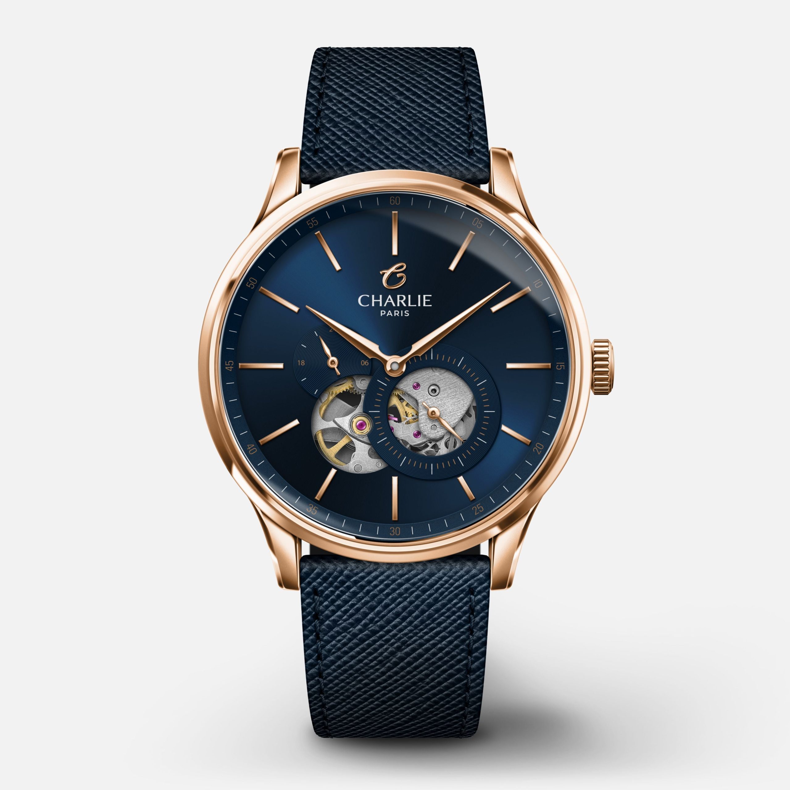 Designet og montert i Frankrike, Initial Open Heart blue solstråle-urskive har rene linjer og et design som er både klassisk og moderne. Denne automatiske herreklokken viser mekanikken i sitt Citizen Miyota Calibre 82S7 movement for a perfect balance between timeless beauty og watchmaking mechanics. With sin 40mm-diameter rosegull-kasse, safirglass og utskiftbare reimer, it’s sure to accompany you for years to come.