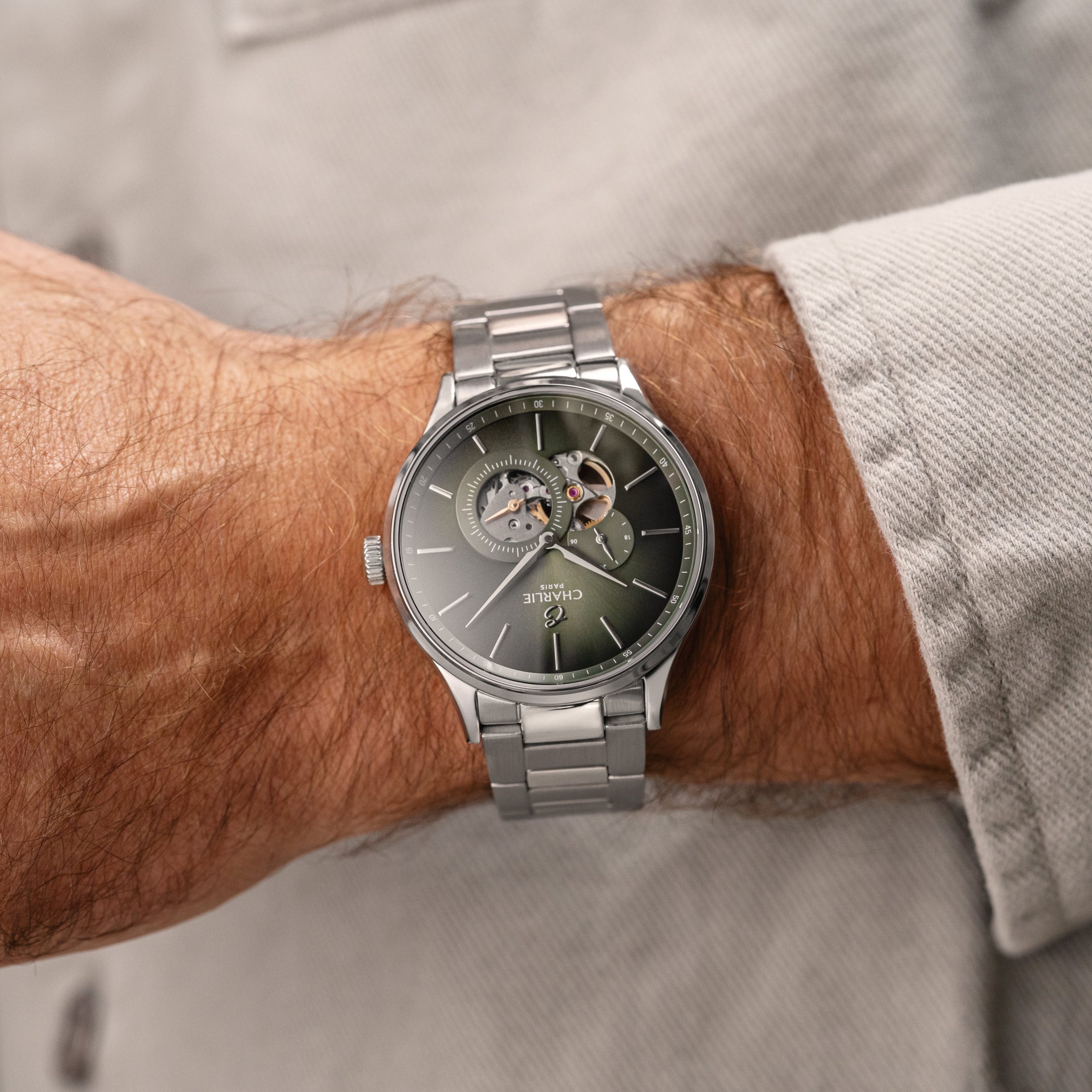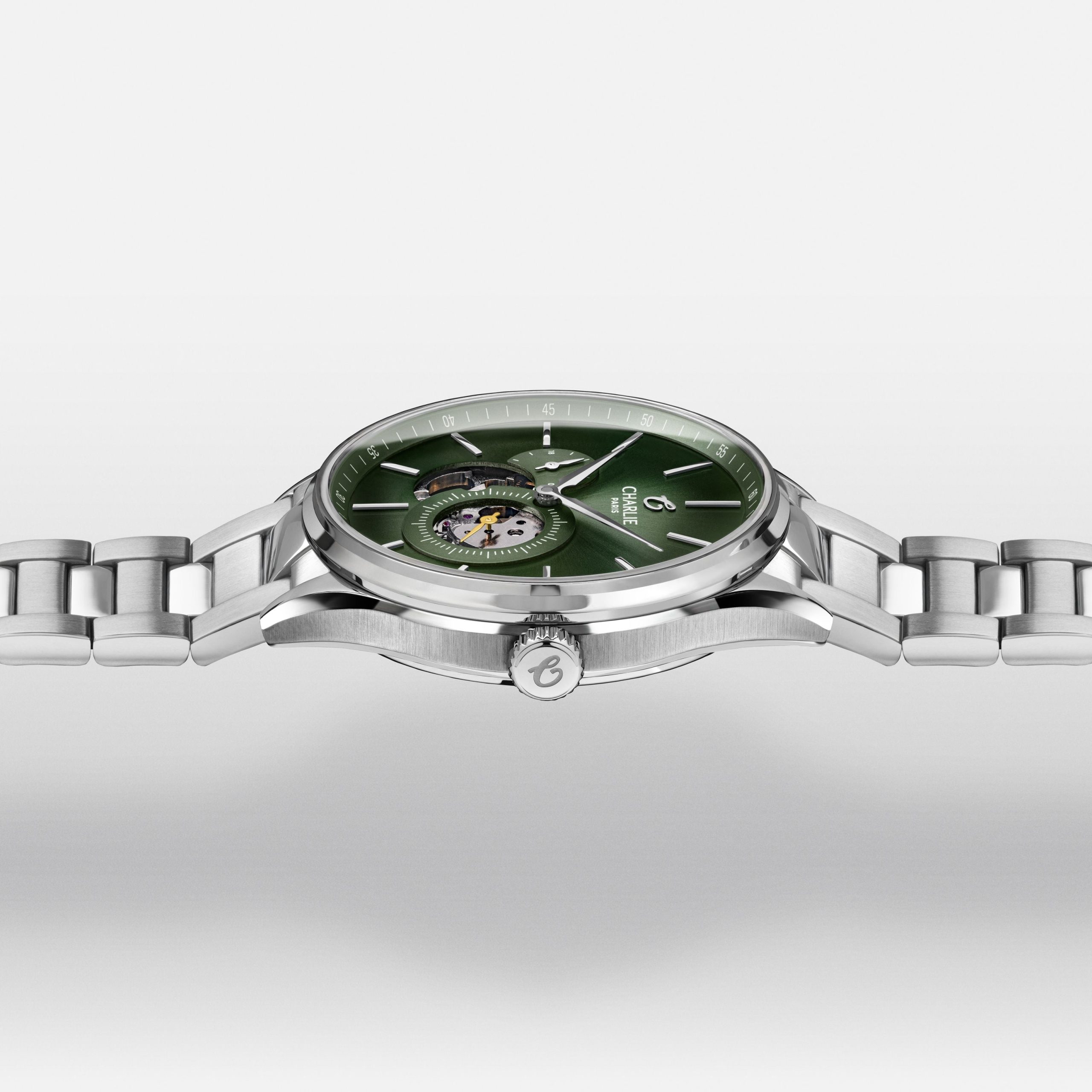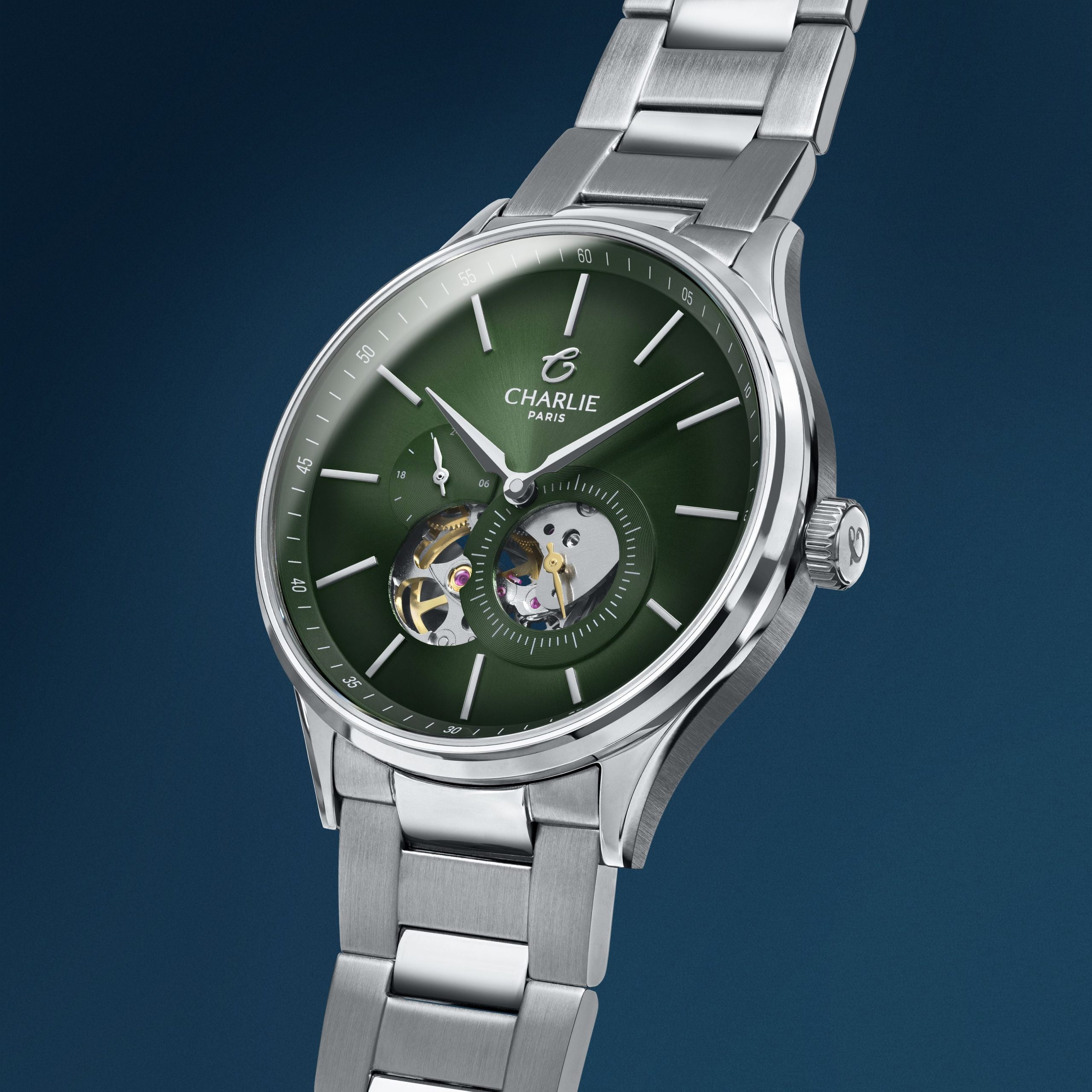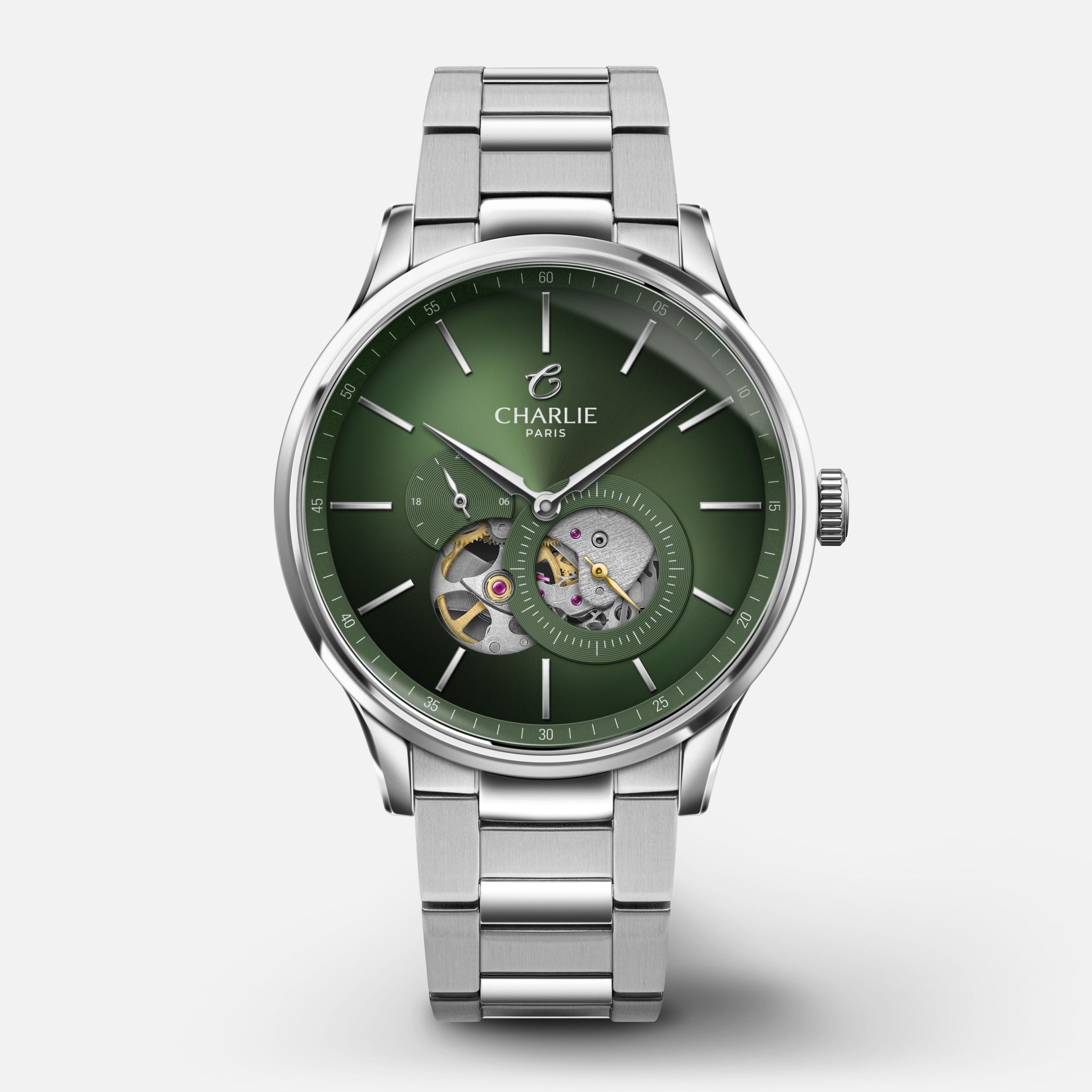 Designet og montert i Frankrike. Denne automatiske klokken med åpent hjerte har en sollyst salviefarget skive med rene linjer som forener klassisk og moderne estetikk. Citizen Miyota Calibre 82S7-verk synlig gjennom skiven. 40mm kasse i 316L rustfritt stål, safirglass, utbyttbare reimer.