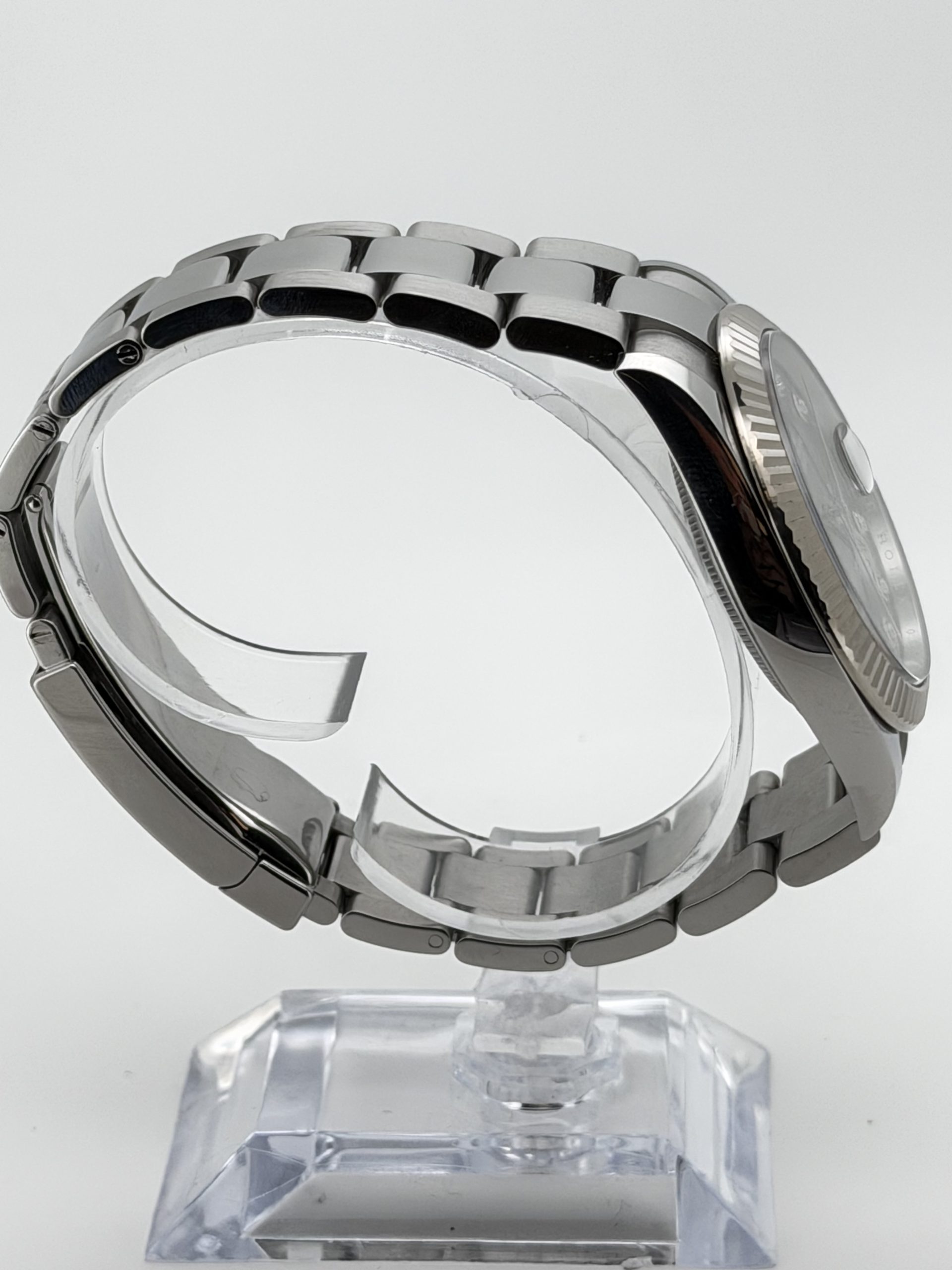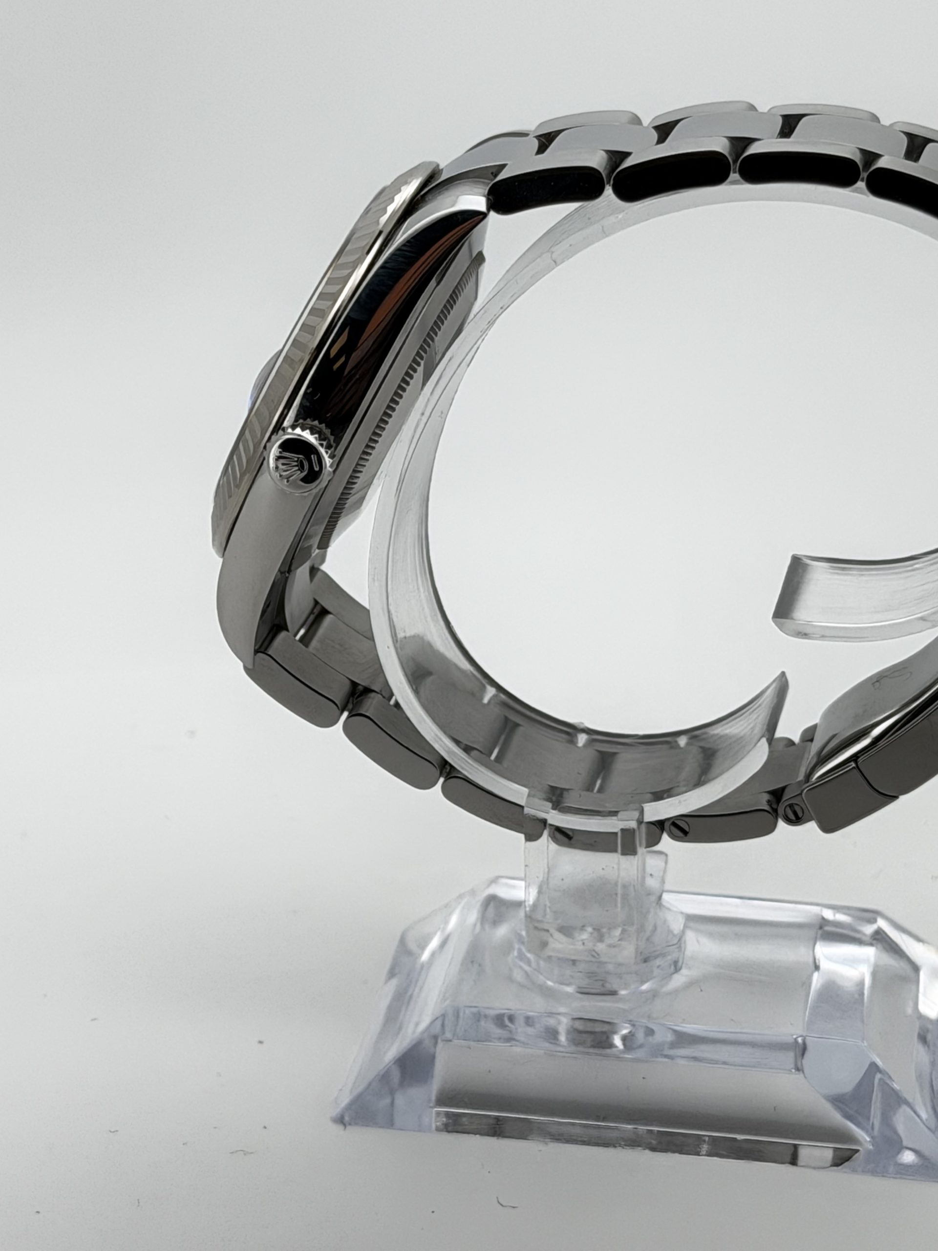 Denne Rolex Datejust 41 kommer med den ettertraktede sunburst blå skiven satt med diamanter, kombinert med den klassiske fluted bezel i hvitt gull. Dette er en perfekt balanse mellom sport og eleganse – like riktig til dress som til hverdags.