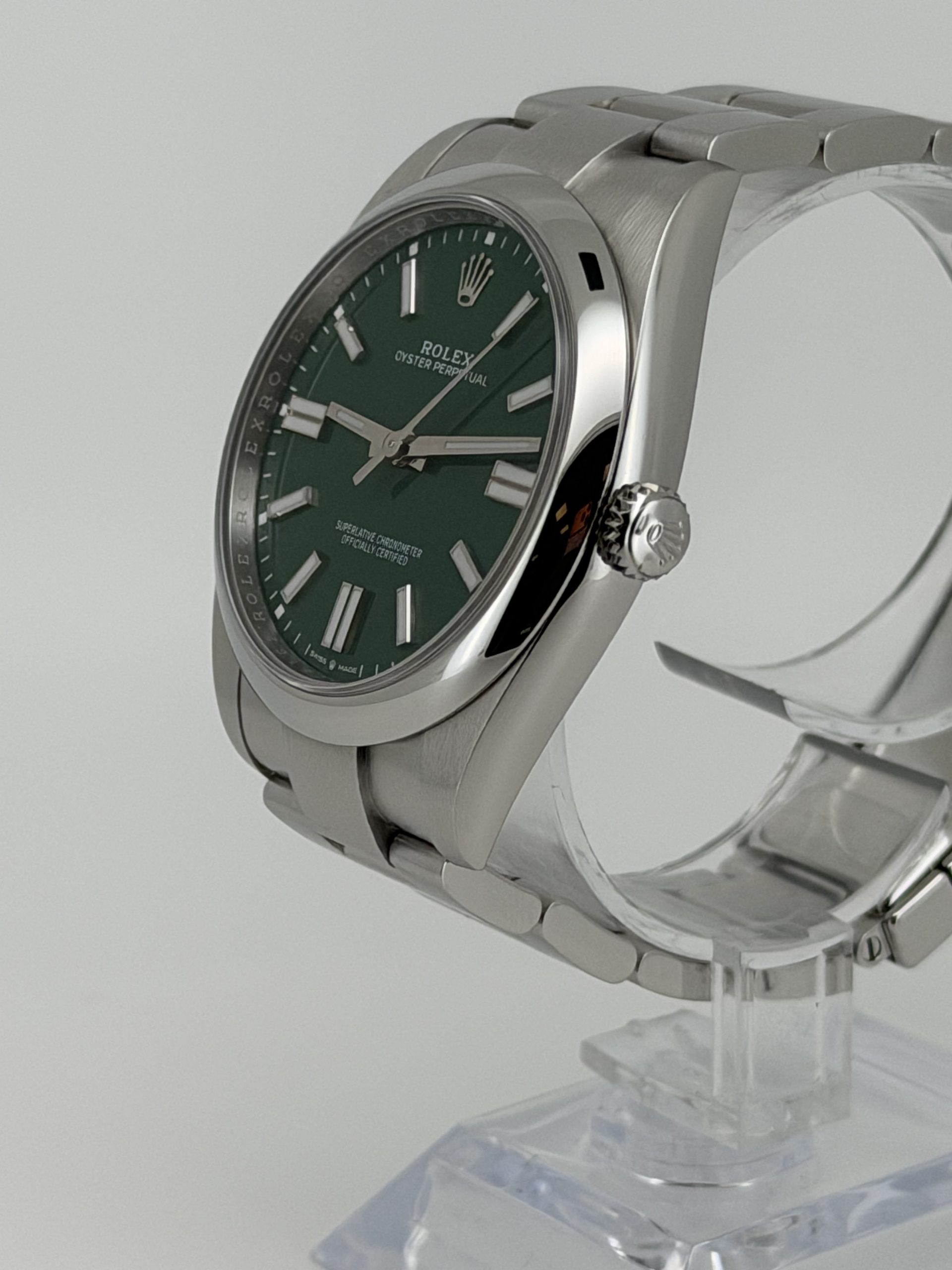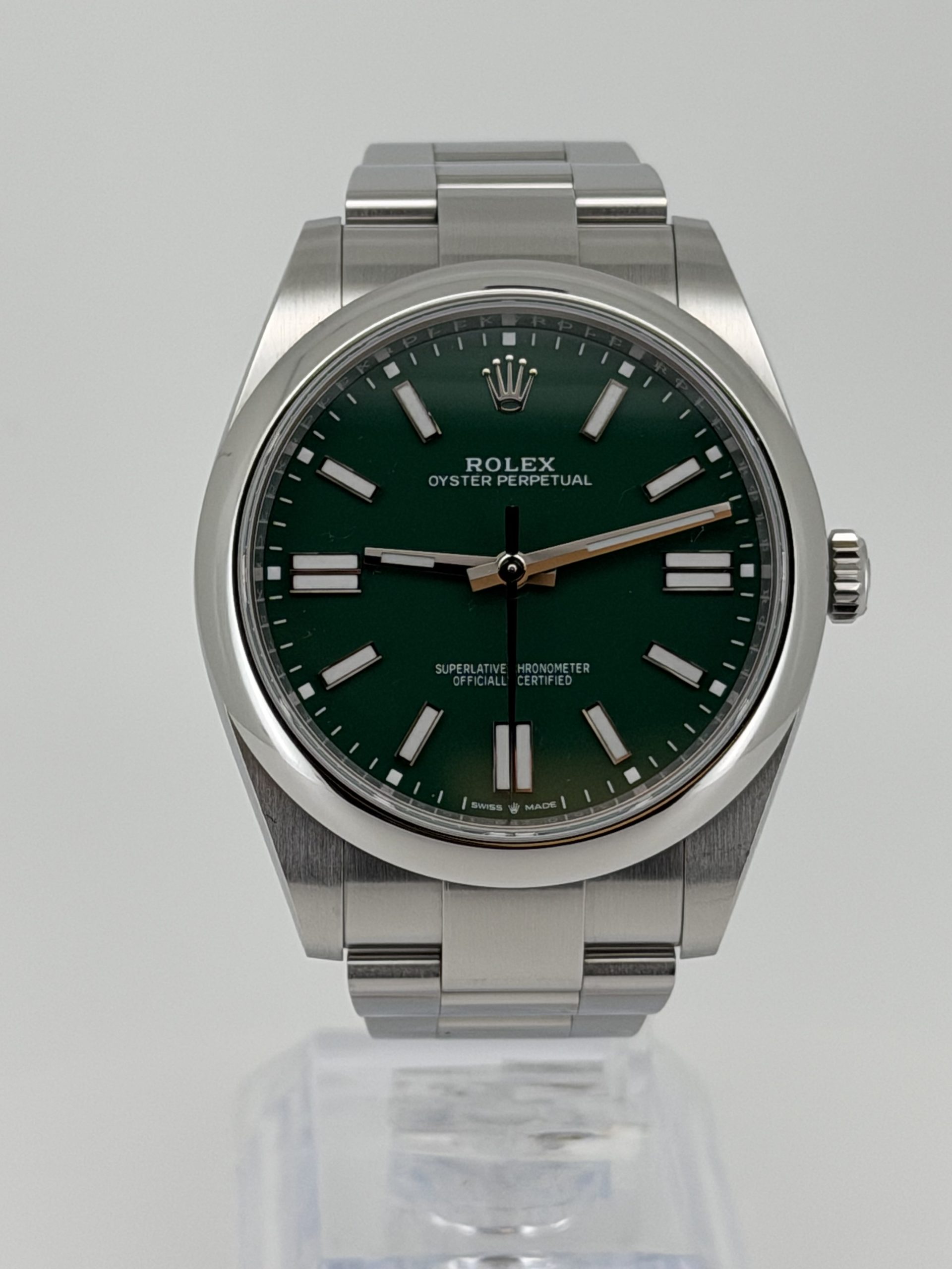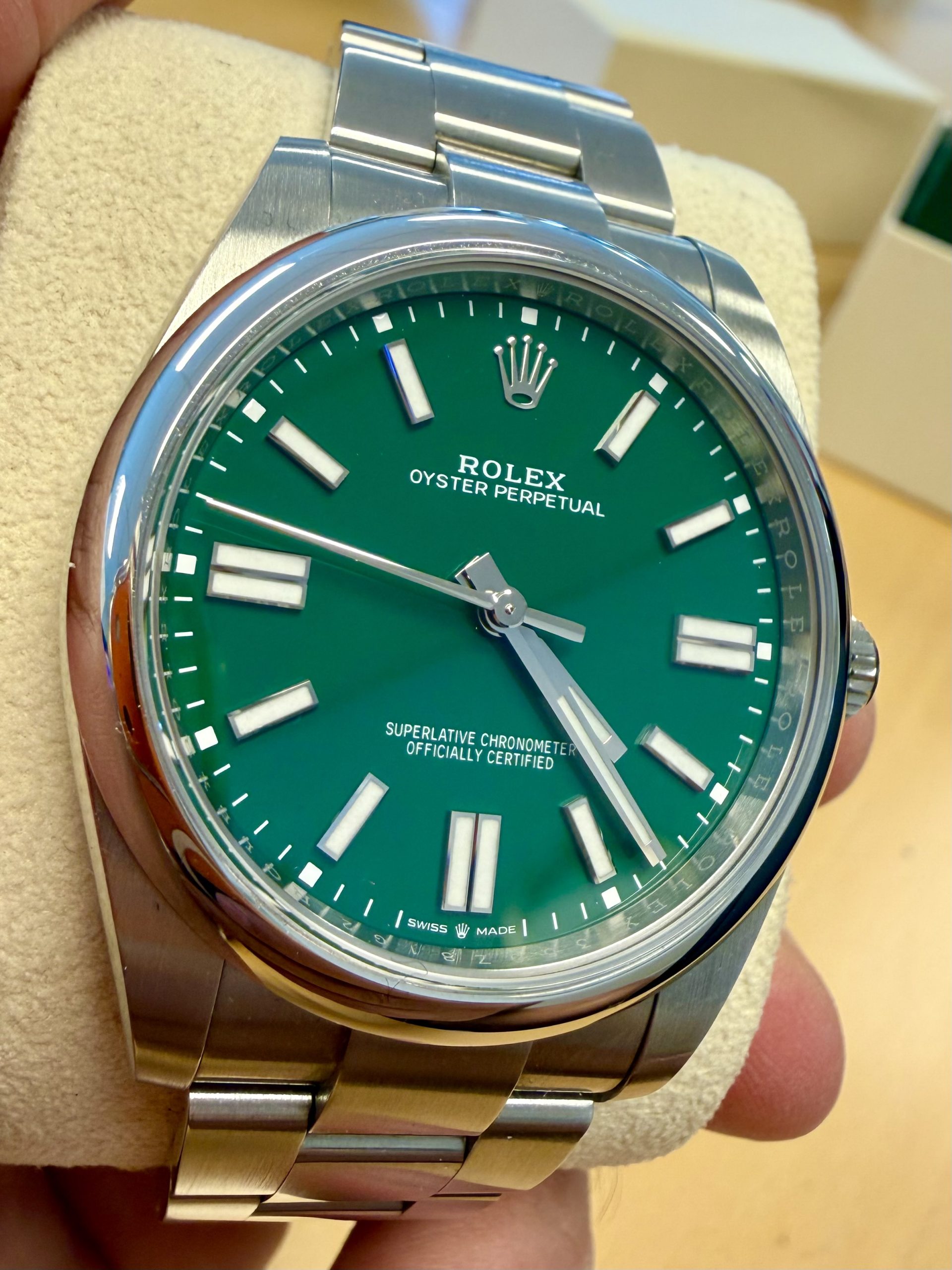 Nå tilgjengelig hos Watch Lounge: en komplett og svært attraktiv Rolex Oyster Perpetual 41 med den ettertraktede grønne skiven. Dette er en 2022-modell som leveres komplett med alt tilbehør som fulgte med fra autorisert forhandler ved nykjøp.