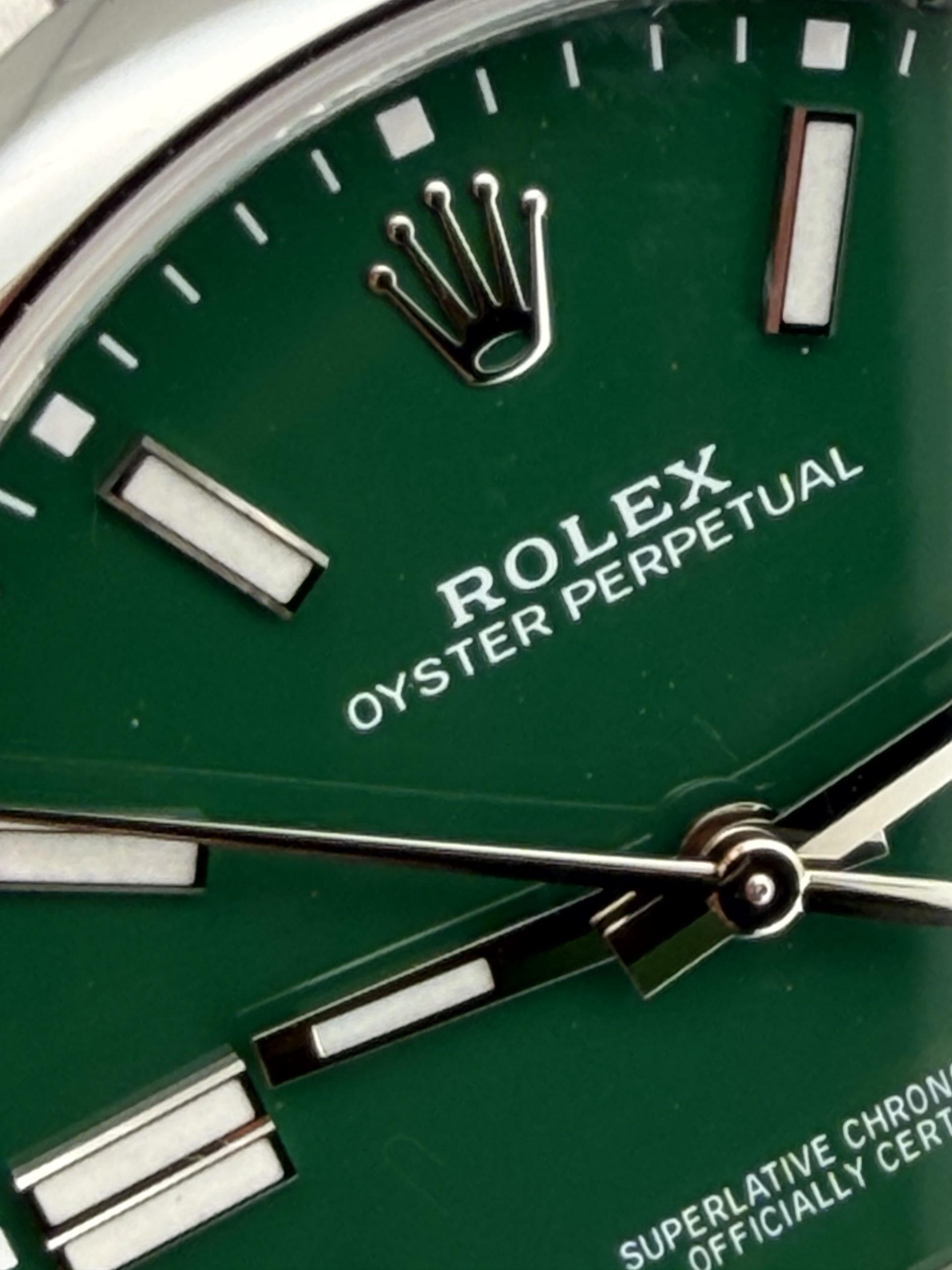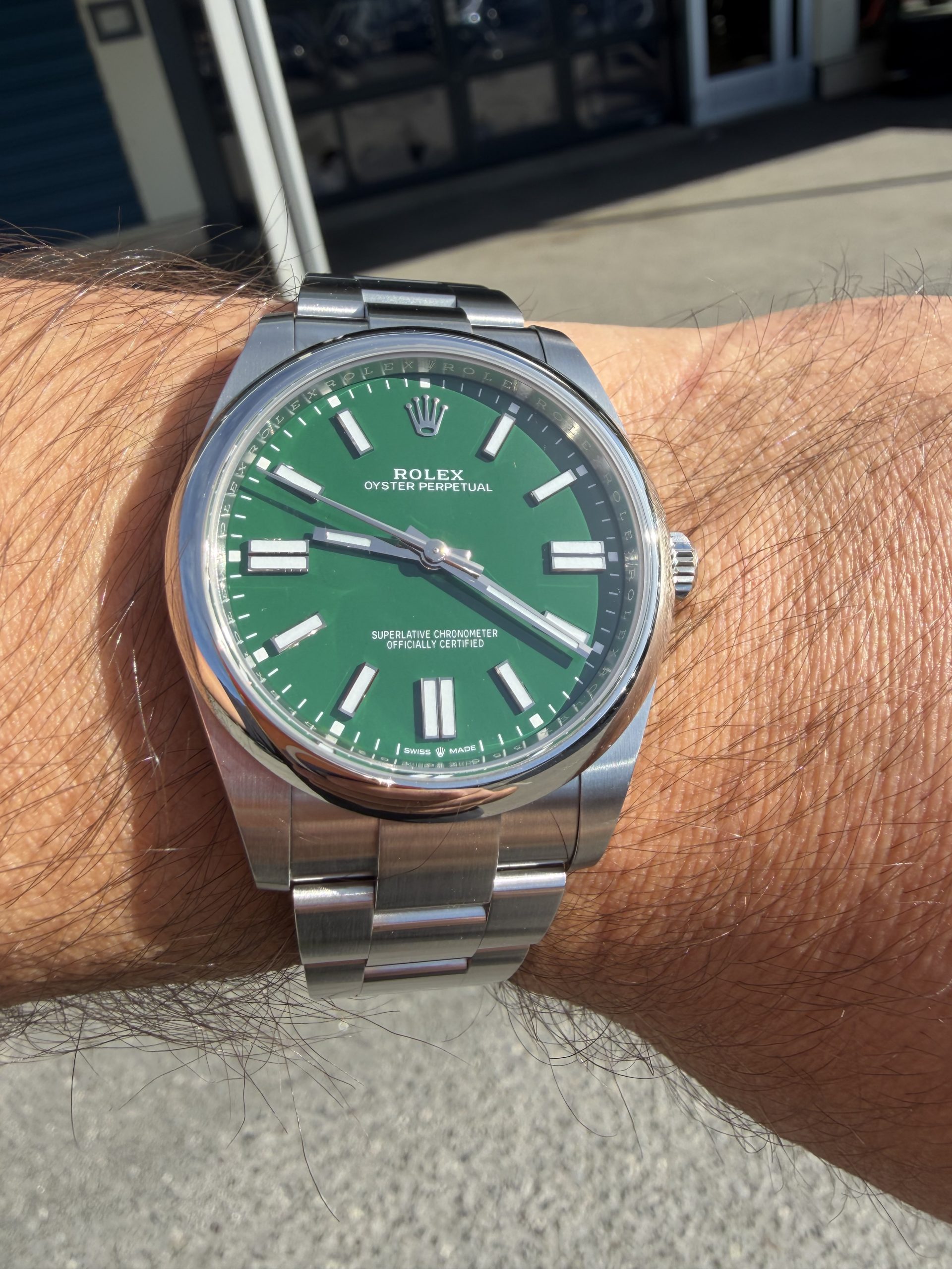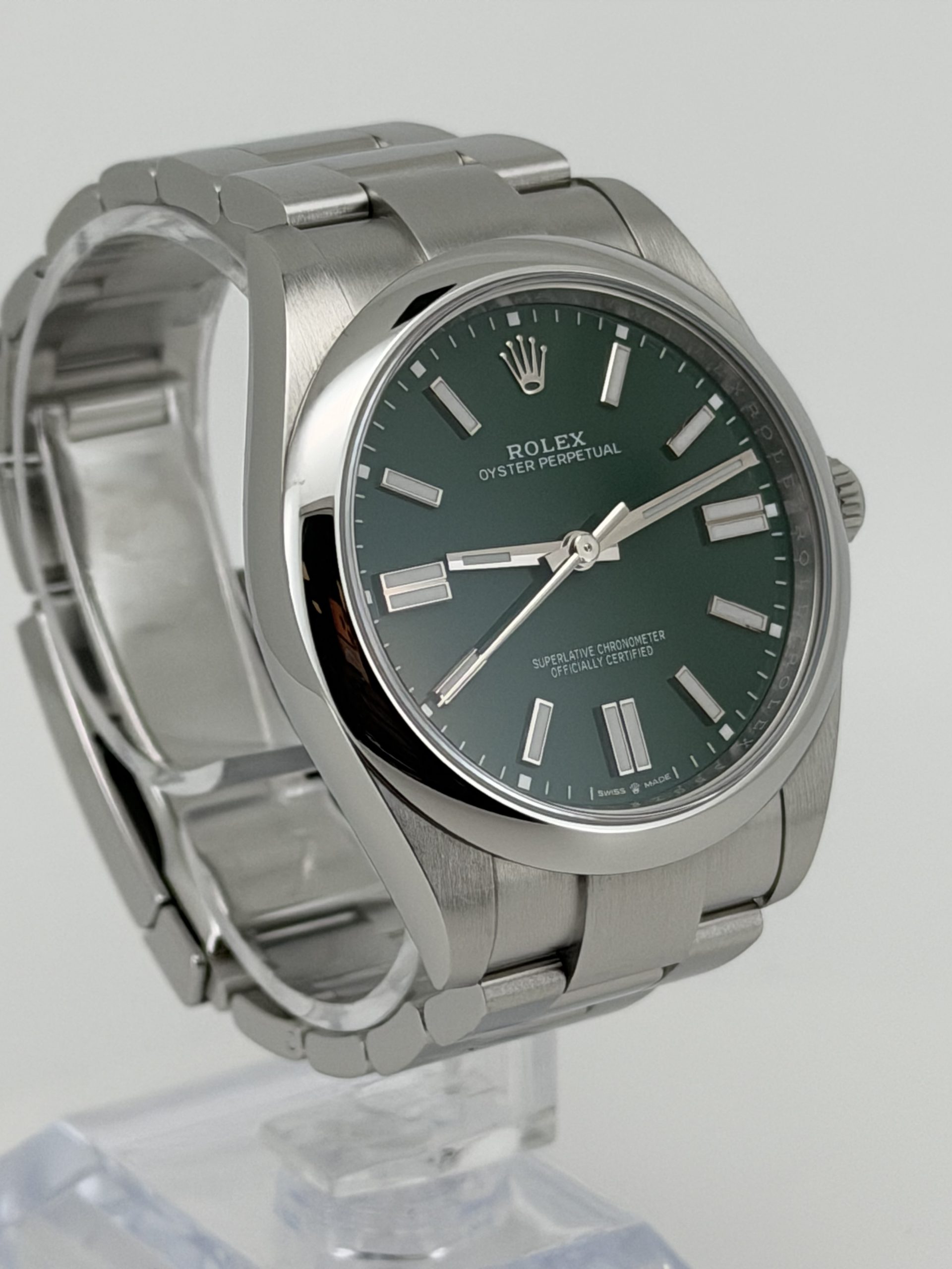 Nå tilgjengelig hos Watch Lounge: en komplett og svært attraktiv Rolex Oyster Perpetual 41 med den ettertraktede grønne skiven. Dette er en 2022-modell som leveres komplett med alt tilbehør som fulgte med fra autorisert forhandler ved nykjøp.