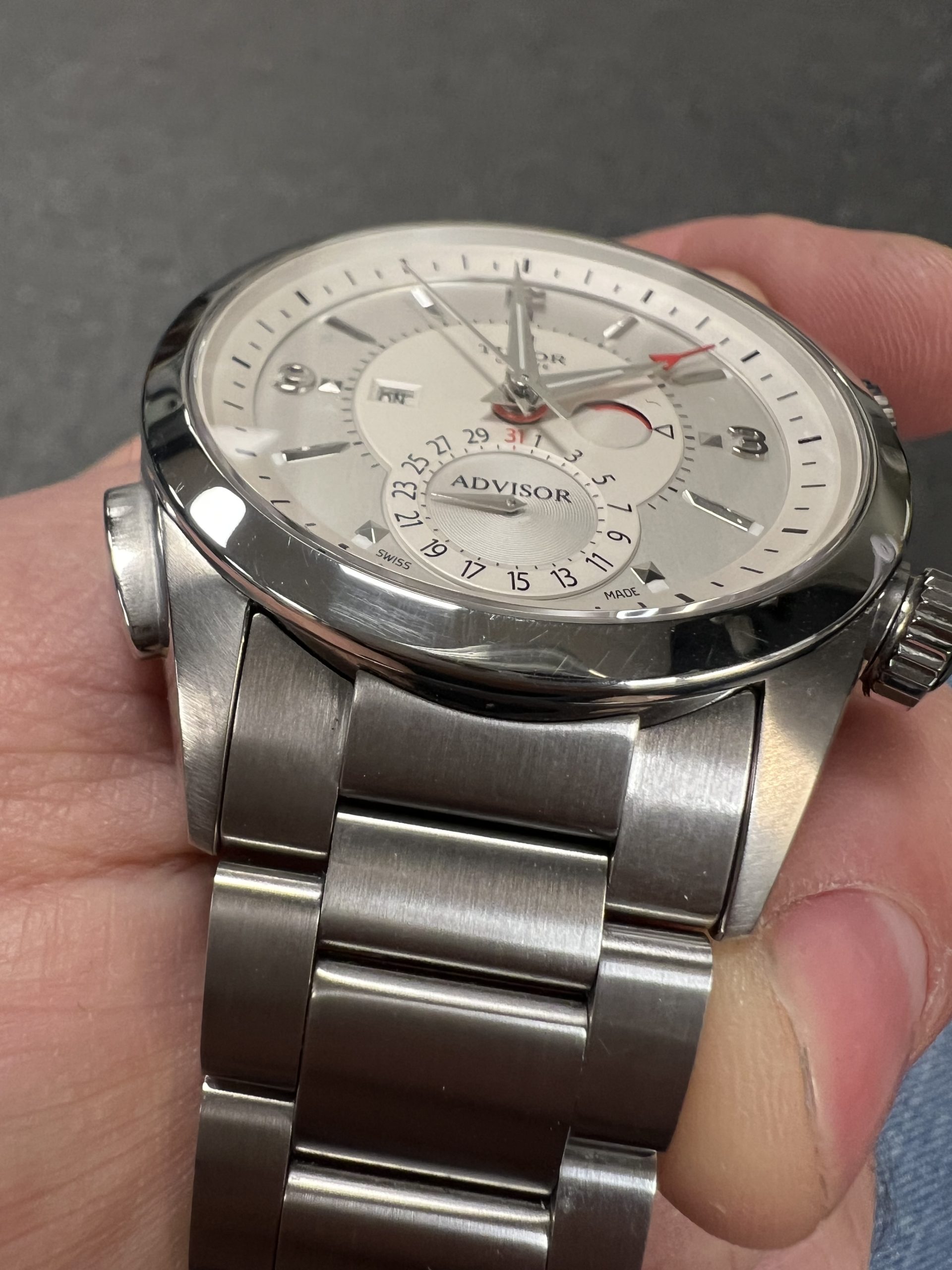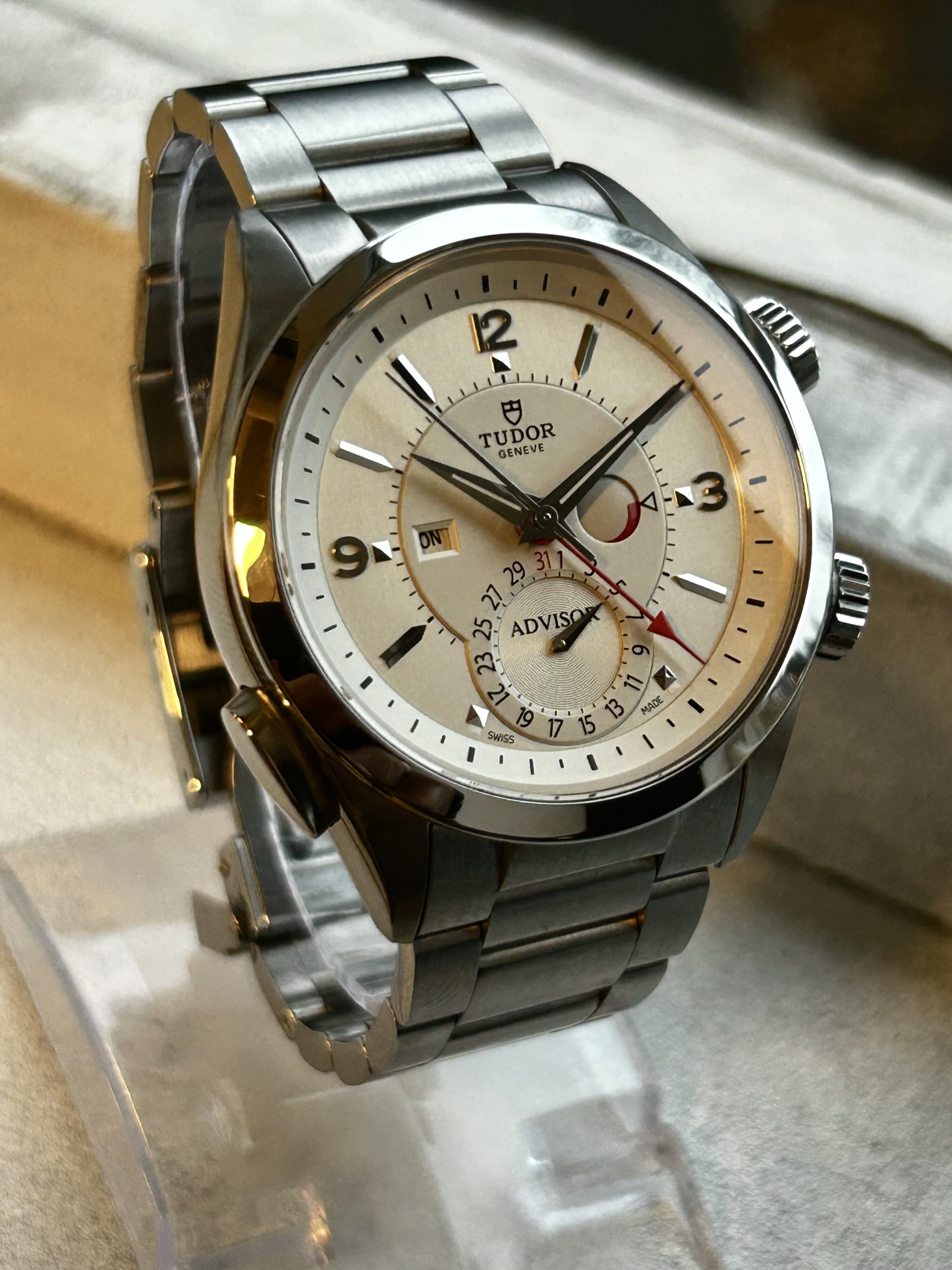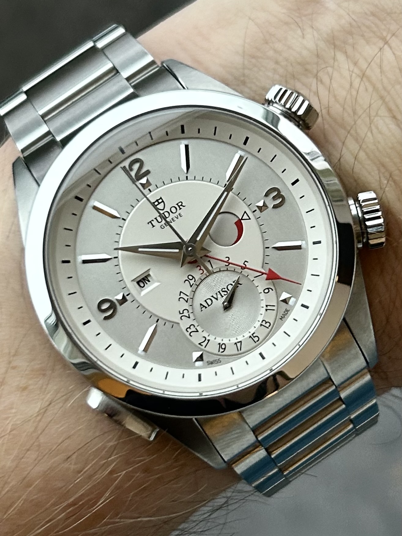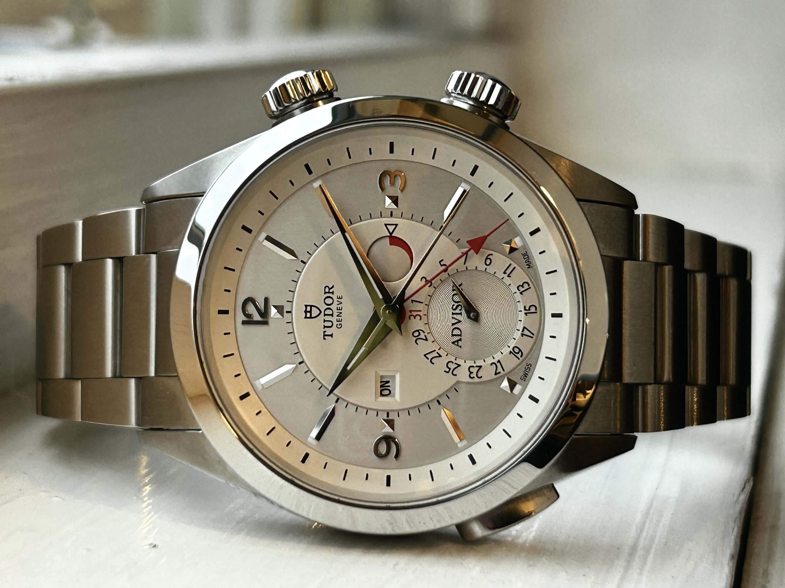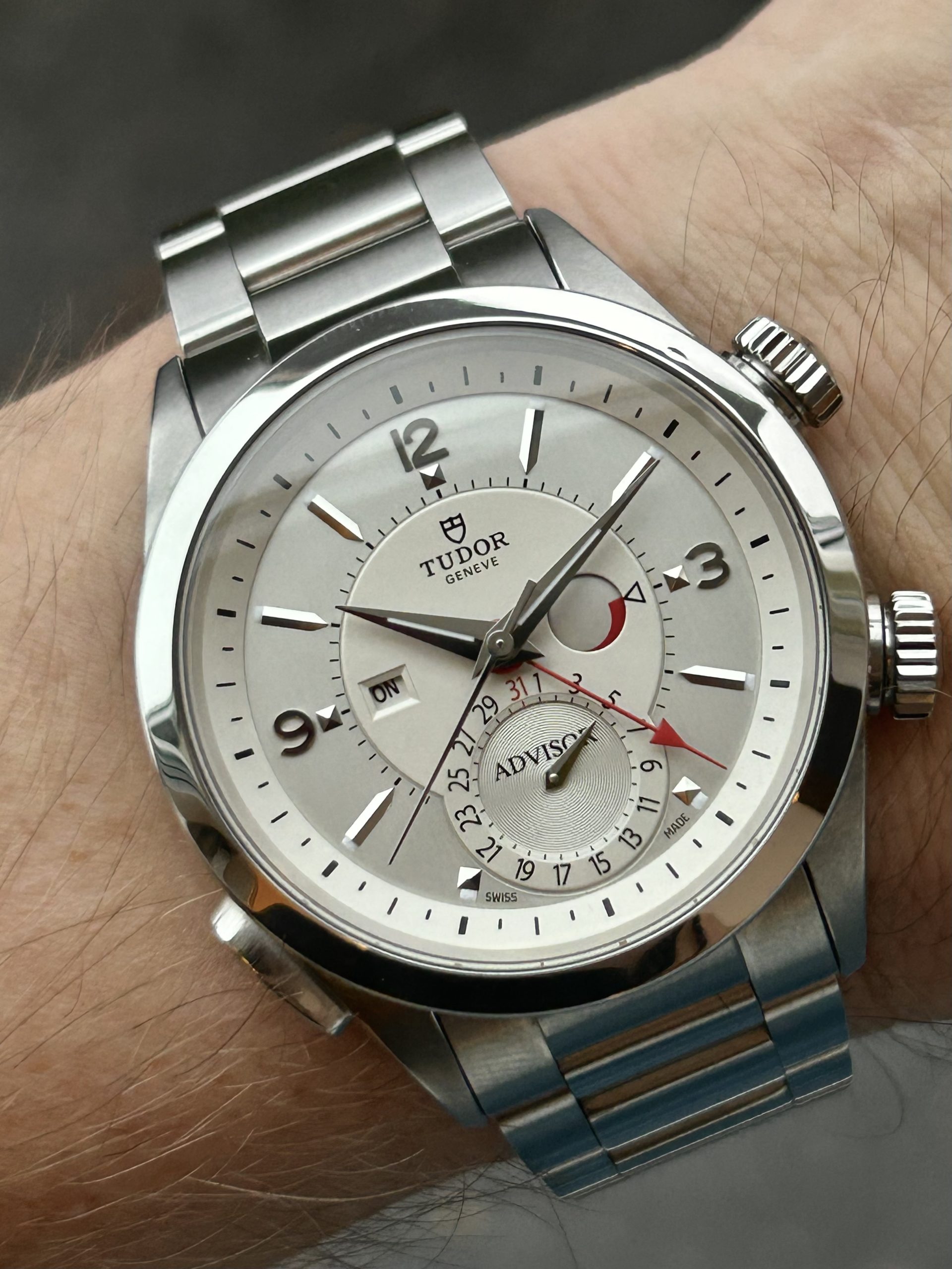 En sjelden mulighet i det norske markedet: Tudor Heritage Advisor – Tudors moderne tolkning av deres historiske alarmklokke fra 1957. Denne 2015-modellen har en elegant sølvfarget skive med tydelige visere, alarmindikator, dato og ON/OFF-funksjon for alarmen.