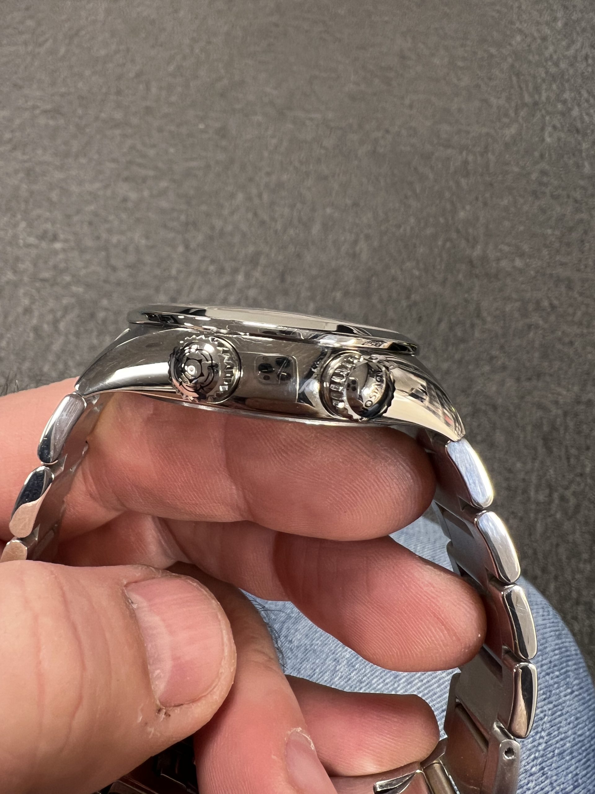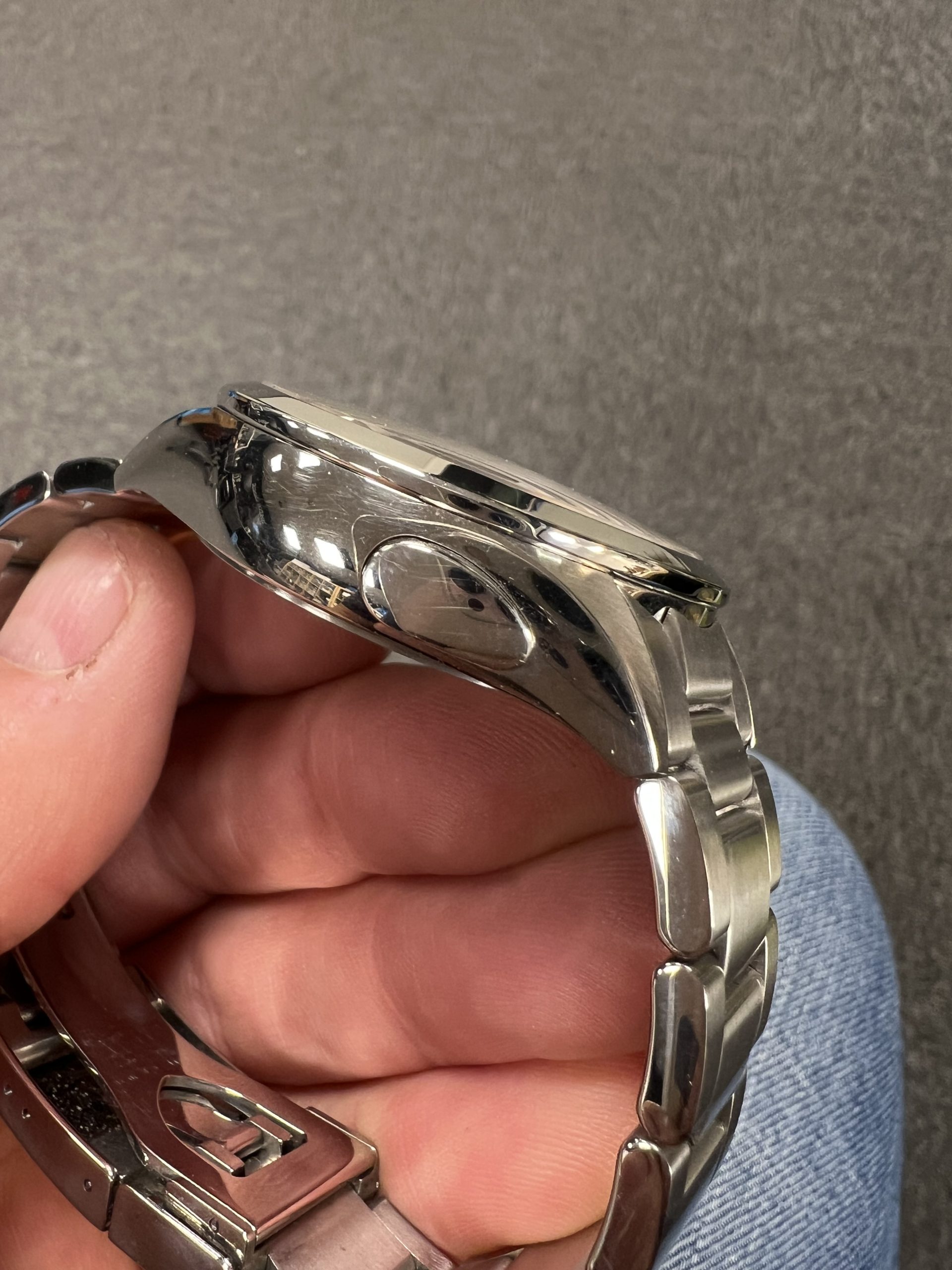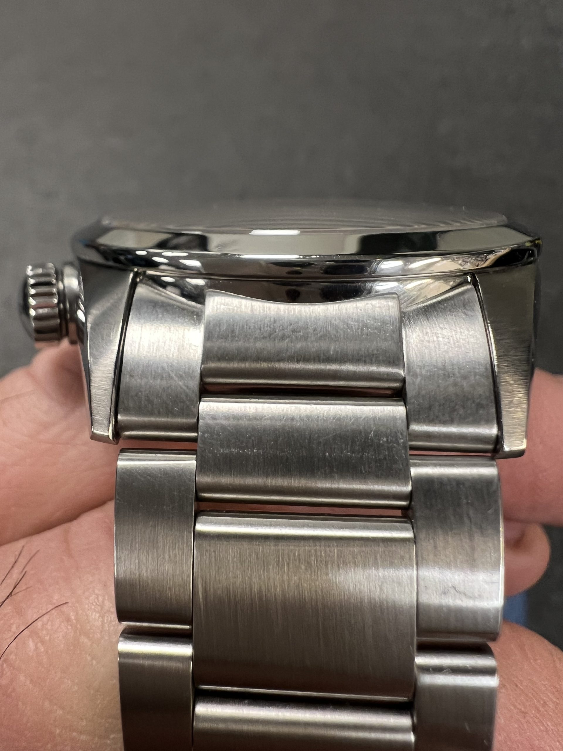 Klokken er meget strøken, med minimal bruksslitasje og fremstår som nær ny. Den leveres som Watch Only, og lenken passer håndledd opptil 20,5 cm.