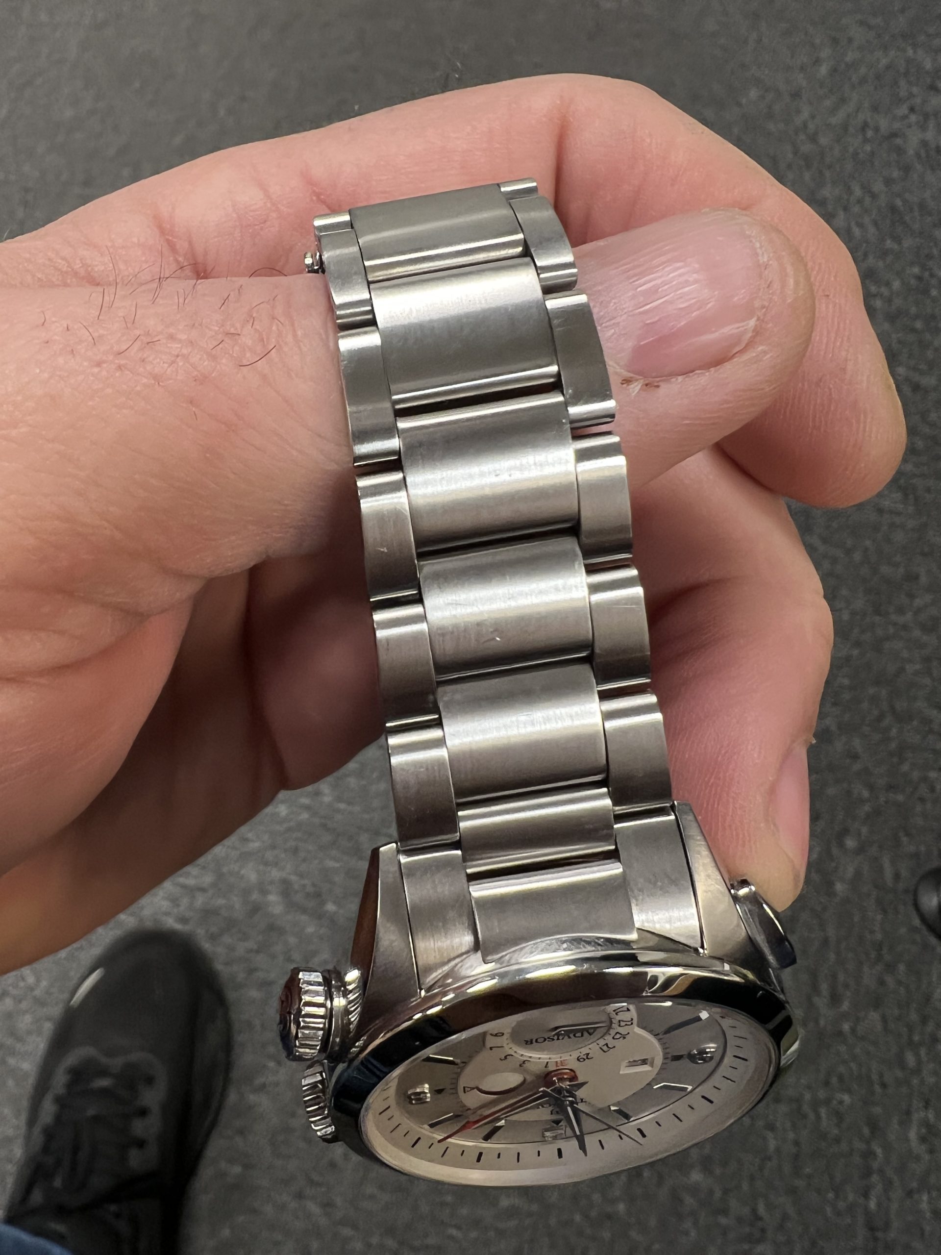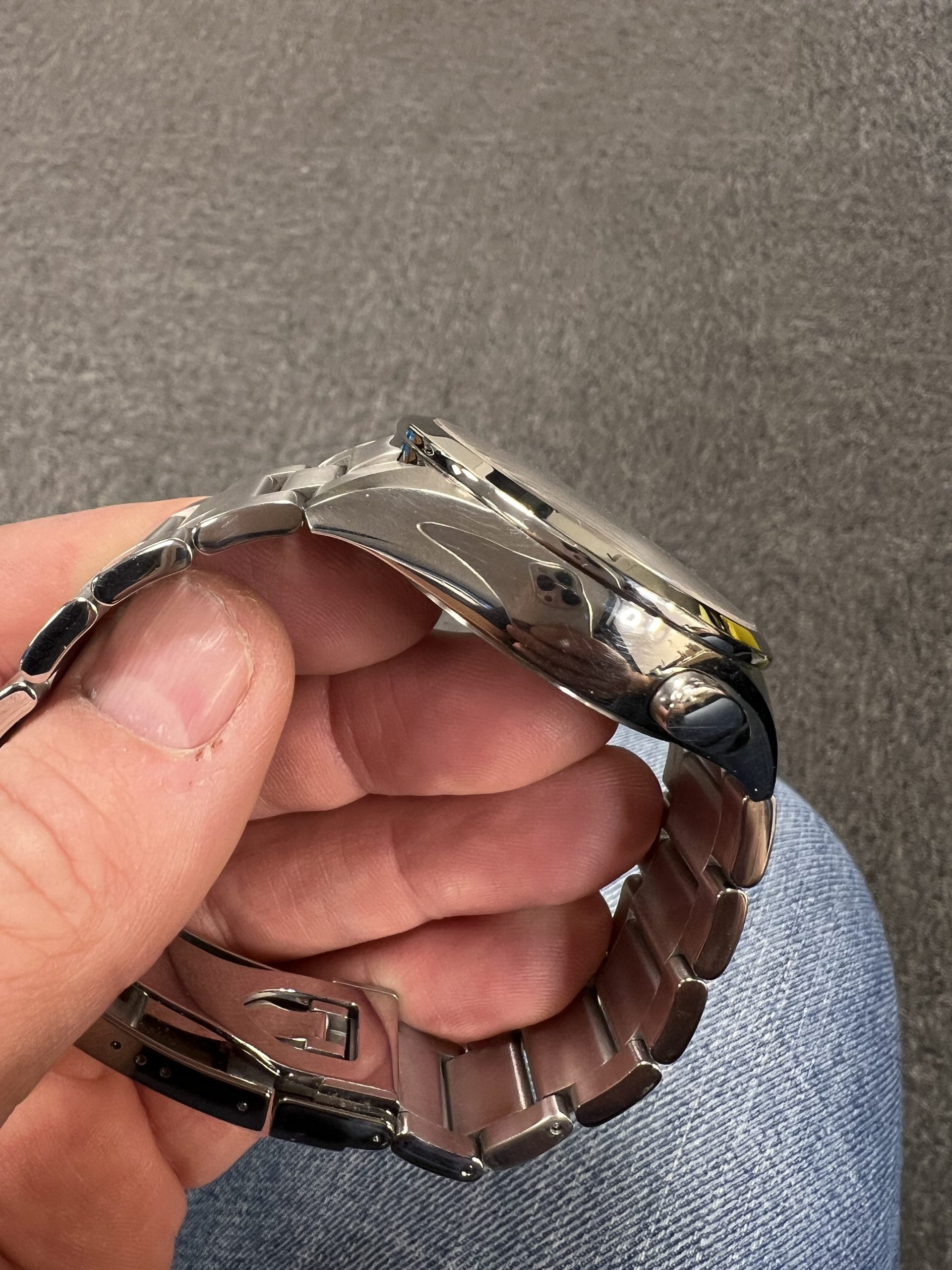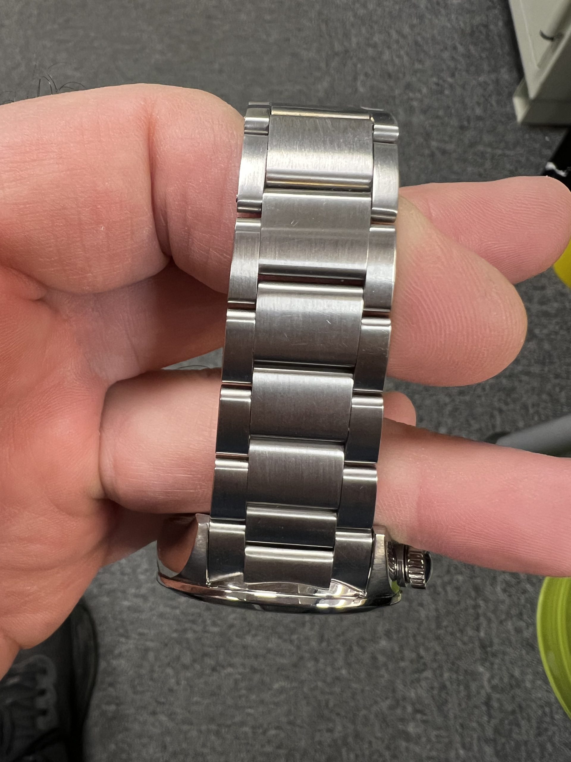 Klokken er meget strøken, med minimal bruksslitasje og fremstår som nær ny. Den leveres som Watch Only, og lenken passer håndledd opptil 20,5 cm.